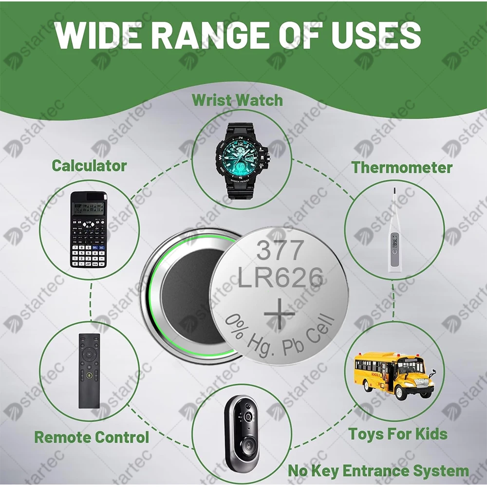 Works with Many Small Devices—LR626 / AG4 batteries that you can use with your toys, wireless doorbell, calculators, watches, mini radios, mini torches, games controllers and other digital devices.
