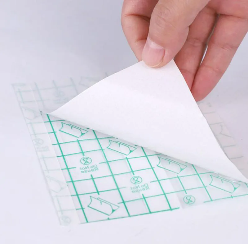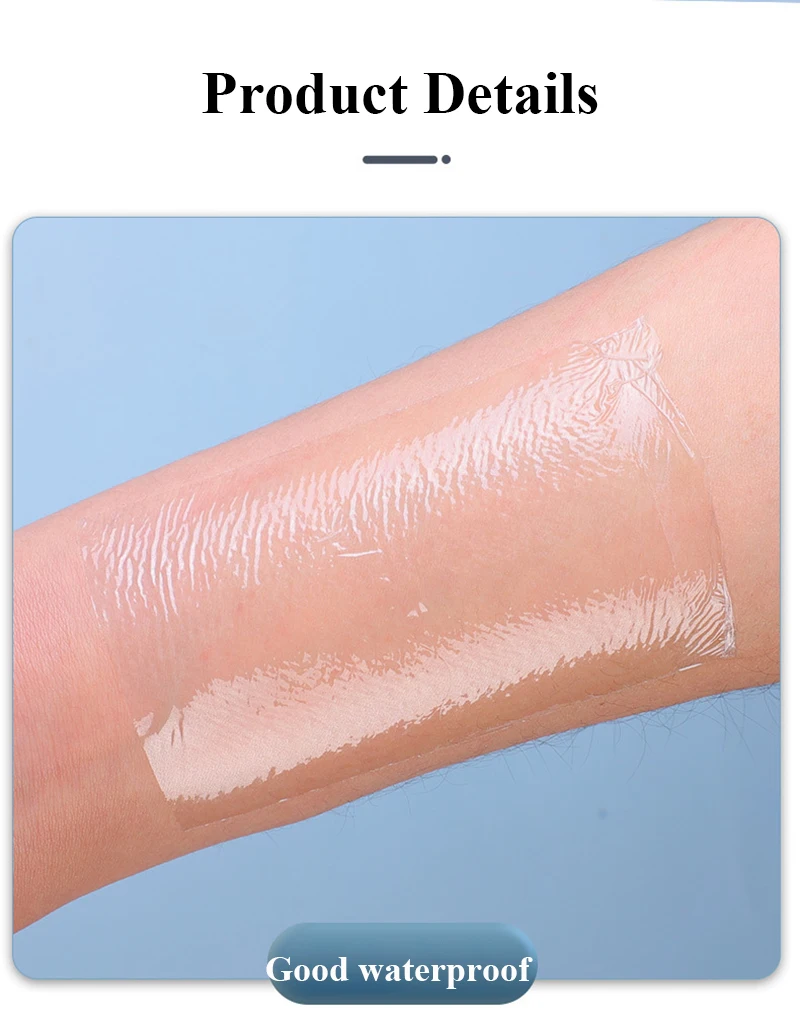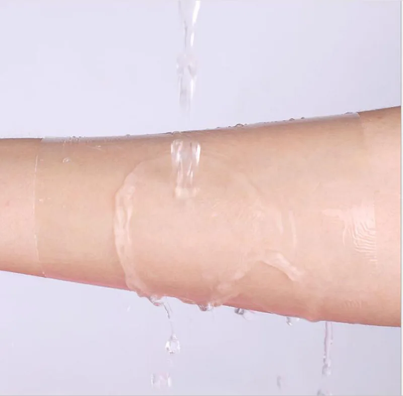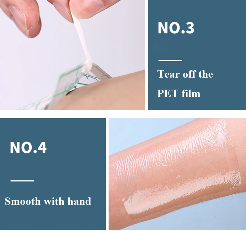 Step 2: After sticking to the skin, tear off the outermost PET film and leave a very thin and very soft PU film on the skin. (Be sure to tear off the PET film on the surface, which is the hard surface film) (the product has three layers, only the middle layer is retained).