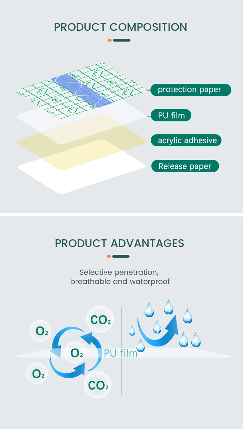 [Material]: It consists of PET film add PU film, pressure sensitive adhesive, silicone oil paper.