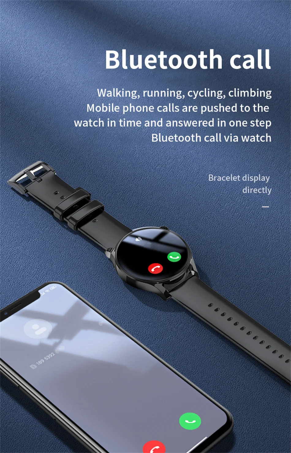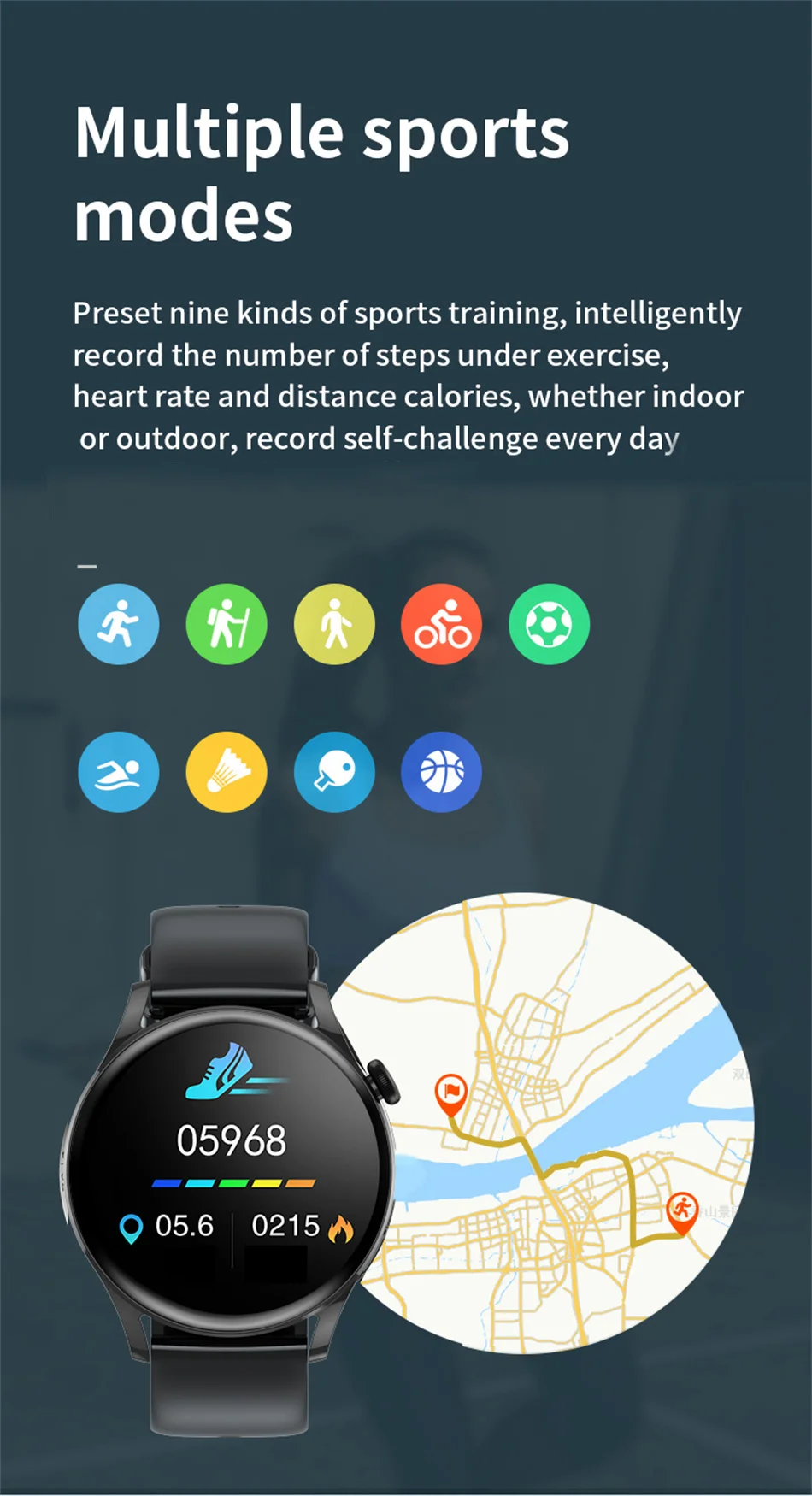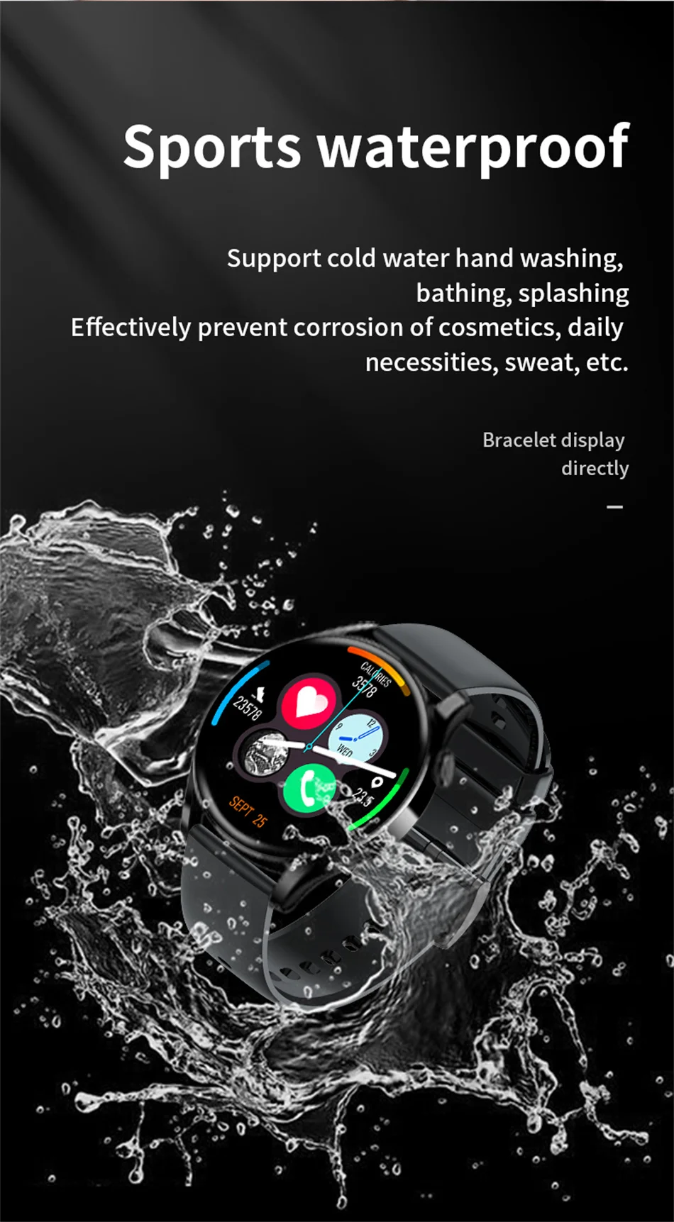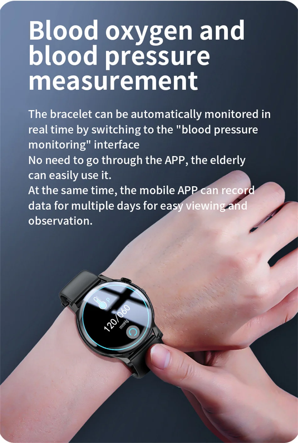 Exercise logging (step counting, distance, calorie counting), exercise mode, message push, message storage, heart rate monitoring, sleep monitoring, blood pressure measurement, oxygen saturation measurement, stopwatch, photo control, music control, full font language, 2.8 inch colour screen touch display. Support external TWS headphones, step, sleep, heart rate, blood pressure, exercise data recording, dial selection, message push, daily alarm, weather information, WeChat sports, mobile music control, female cycle reminder, long seat reminder, water reminder