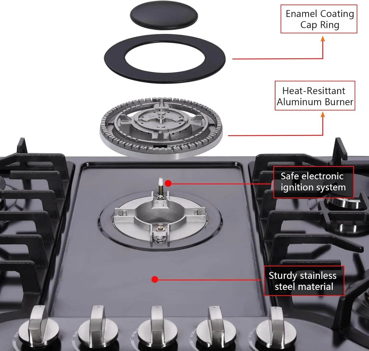 【Easy Maintenance】The cooktop is made with a 304 stainless steel surface, which is heat resistant and will not discolor. 5 sealed burners prevent food from falling into them. You can simply remove the grate and wipe it clean with water or detergent.
