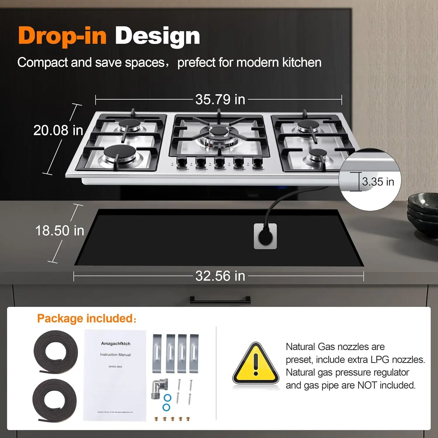 36 Inch Gas Cooktop 5 Burner Gas Stove Top Total 34,588 BTU Built-in Stainless Steel 36Inch Gas Hob with Thermocouple Protection