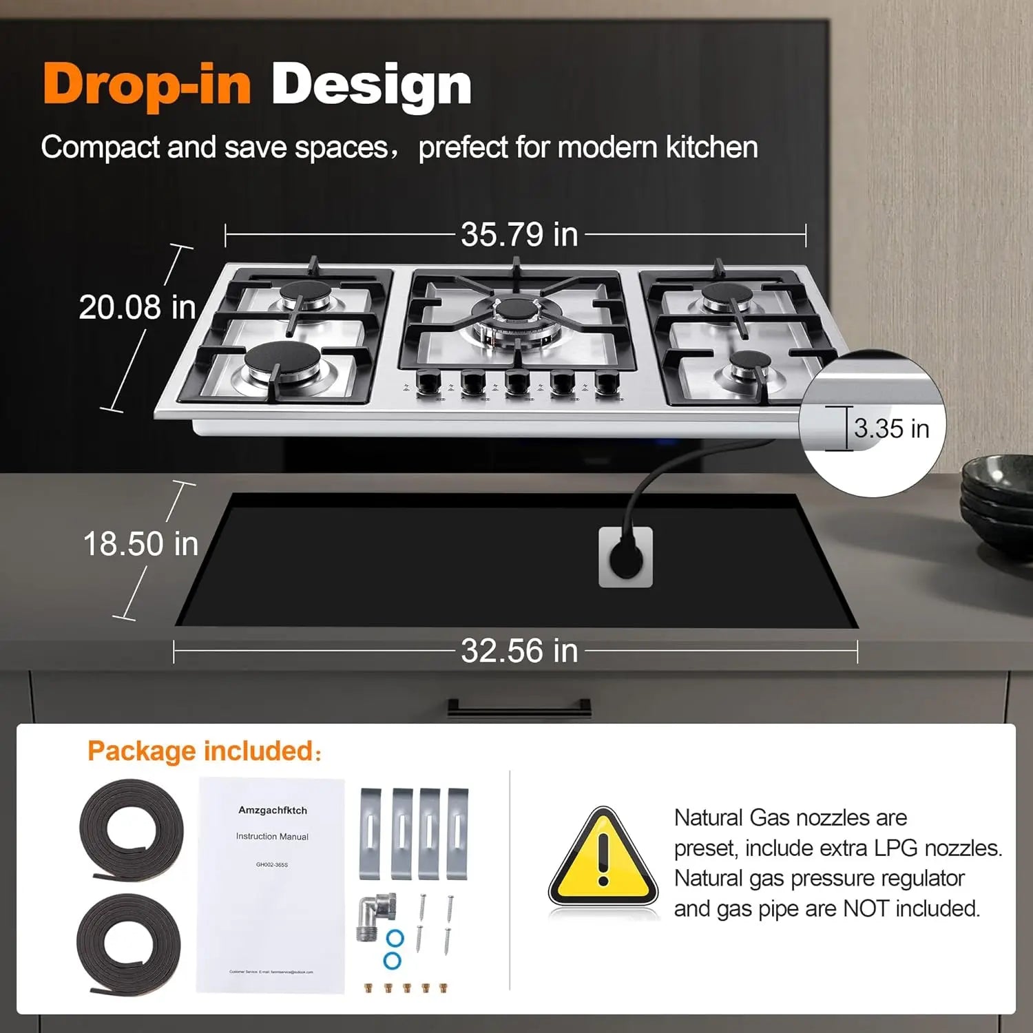【Product Dimensions and 1-Year Quality Warranty】Product size: 35.79" W x 20.08" L x 3.35"H, Cut out size: 32.56" W x 18.5" L. Please verify this propane cooktop is the right size for you. We provide a 12-month warranty for the gas cooktop. If you are not satisfied with the product, we will provide a full refund or free exchange guarantee, please feel free to contact us if you have any problems.