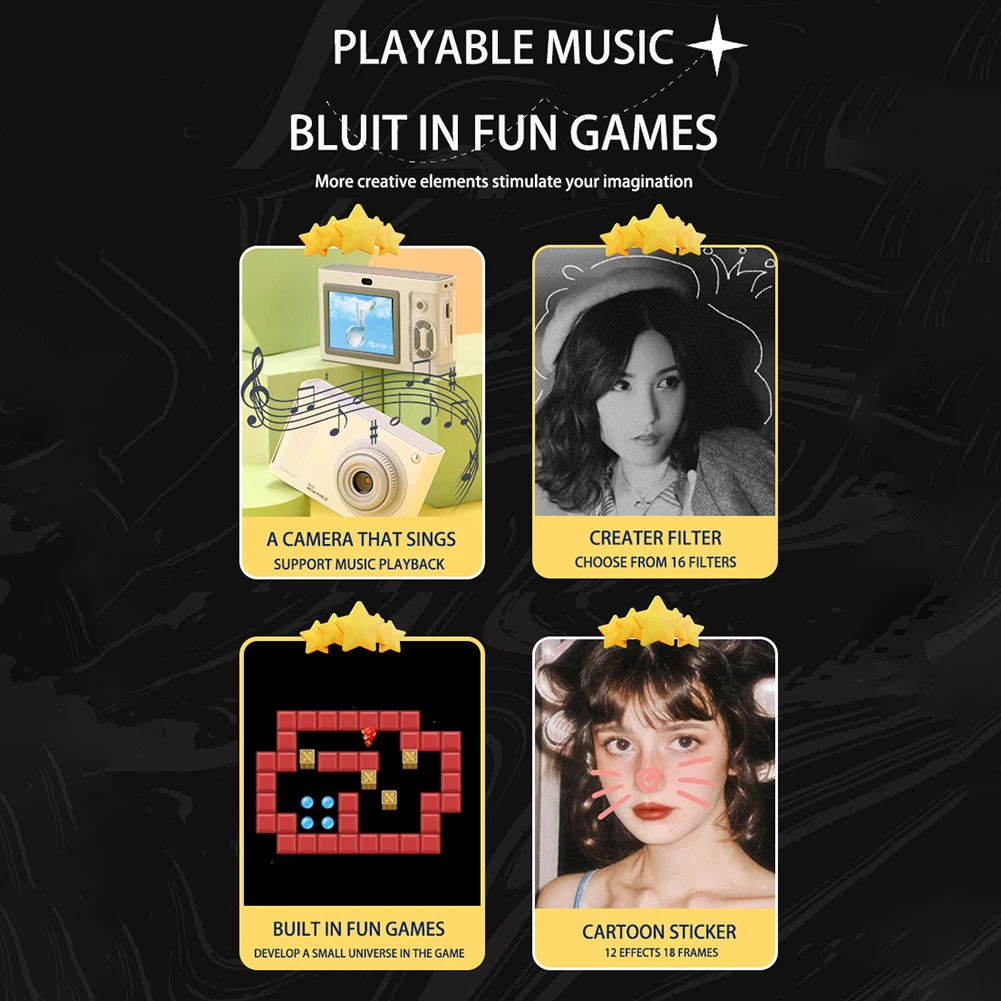Feature: 1. Dual High-Resolution Cameras: The mini camera features front and rear dual cameras with 48 million high-definition pixels. With just one click, you can swiftly switch to selfie mode and capture beautiful moments in stunning clarity. 2. 1080P HD Video Recording: Enjoy the thrill of creation with our digital camera that offers 1080P high-definition video recording. It's perfect for crafting daily engaging vlogs and capturing all the fun moments in crystal-clear quality. 3. Versatile Features for Kids: Designed with kids in mind, this kids camera boasts an AF auto-focus feature ensuring every shot is crisp and clear. It supports 4x digital zoom, anti-shake, various filters, and a fill light, making it a multifunctional digital camera that provides a perfect shooting experience for the young photographer. 4. Long Battery Life: Equipped with a 600mAh large-capacity battery, our video camera ensures worry-free usage. It supports shooting while charging, allowing for continuous use and ensuring you never miss out on capturing any moment. 5. The Perfect Gift: Easy to use for anyone, this vlogging camera makes an ideal gift for Christmas, birthdays, parties, Thanksgiving, and more. Its simplicity and functionality make it a wonderful present that encourages creativity and fun. Specification: Origin: Mainland China Sensor Element Type: CCD Optical Zoom: 2x - 7x Special Feature: None Sensor Size (inches): 1/2.3 inches Image Resolution (Video): 1080i/P(1920*1080) Focal Length: 12 - 50mm Color: black, white, silver, pink (optional) Camera pixels: 48 million pixels Battery capacity: 600mAh Camera resolution: 1080P/720P/VGA Display: 2.4-inch IPS high-definition screen Zoom: 4x zoom Lens: 200W pixel lens Memory expansion: 64G Functions: dual front and rear cameras, video playback, zoom support, multiple filters, MP3 playback, long battery life, multiple borders, multiple mini games Gross weight: 212g Product size: about 91*59*23mm/3.58x2.32x0.91inch Packaging size: about 113*113*55mm