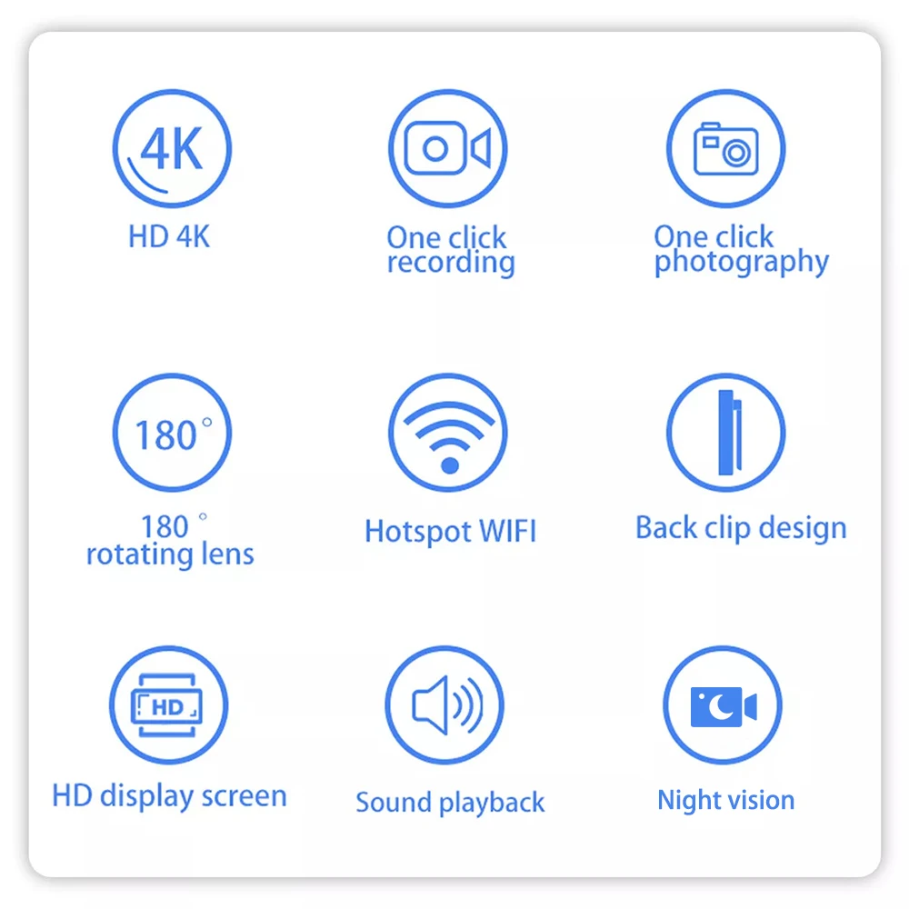 *Main features: WiFi, video recording, photo taking, audio recording, loop recording, motion detection, infrared night vision, file viewing, file deletion, formatting, back clip.