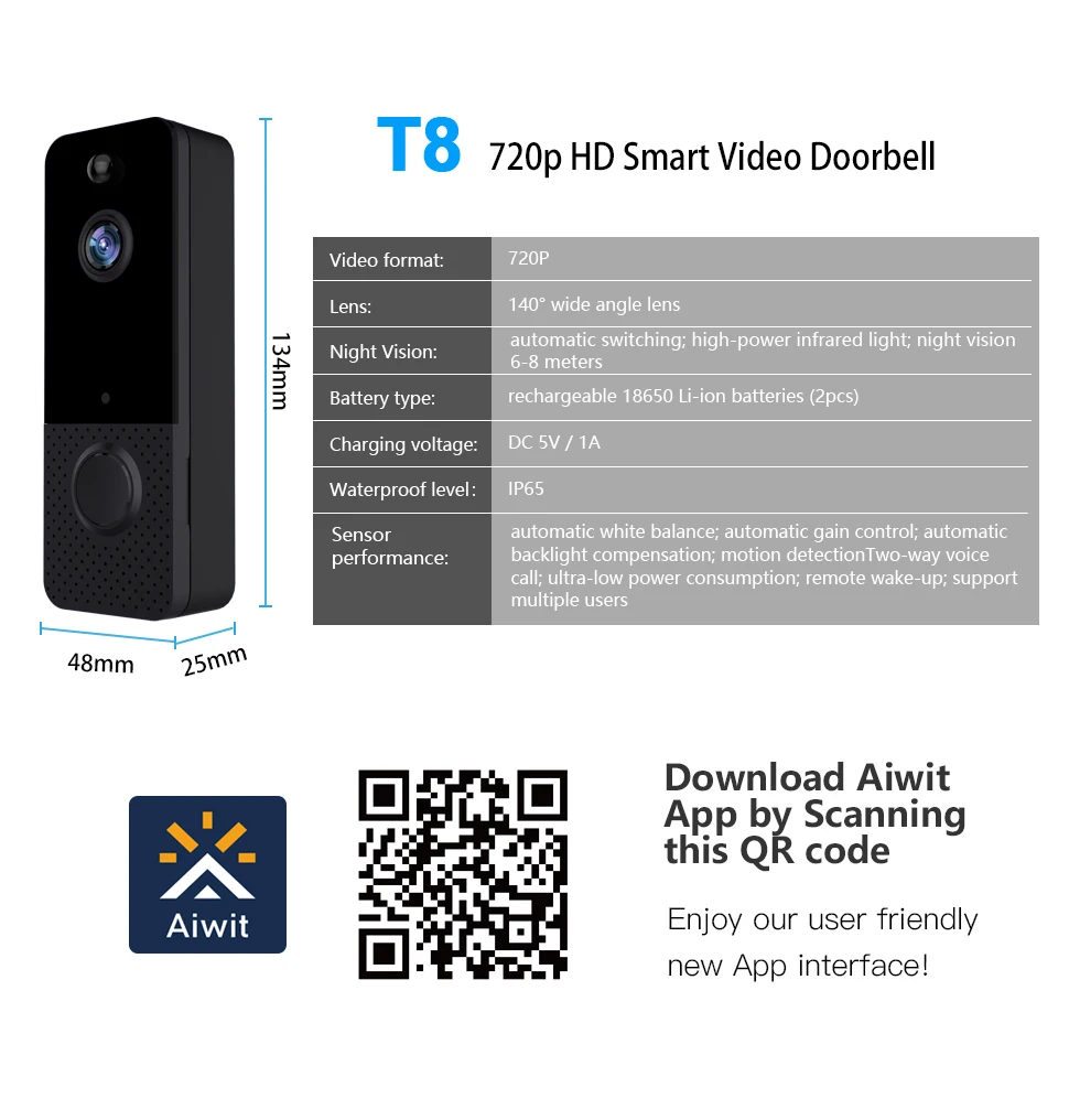720P Aiwit APP WiFi Doorbell Low Consumption Battery Power Visual Door Peephole Video Eye Night PIR Home Security Doorviewer