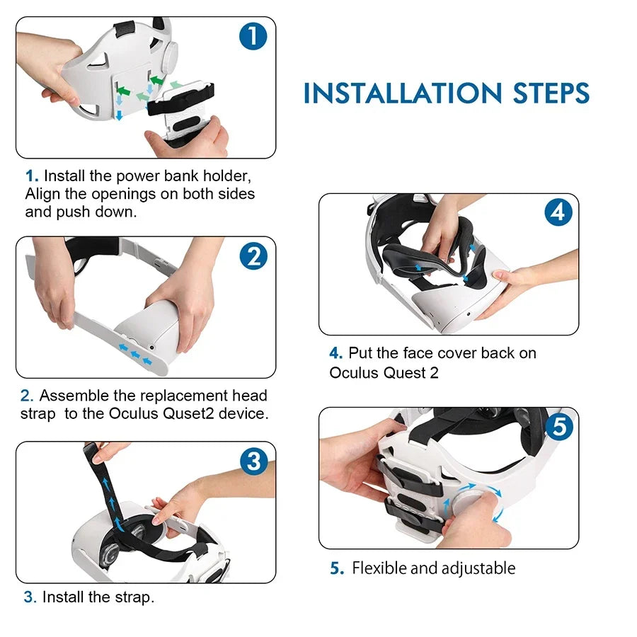 Enhanced Comfort: The head strap of Oculus Quest 2 VR with Durable and lightweight ABS plastic with soft PU memory foam on the inside and has a high stability system that can support the head for a long time. After installing the power bank, it can perfectly balance the weight of Oculus Quest 2,and is more stable when worn on the head.
