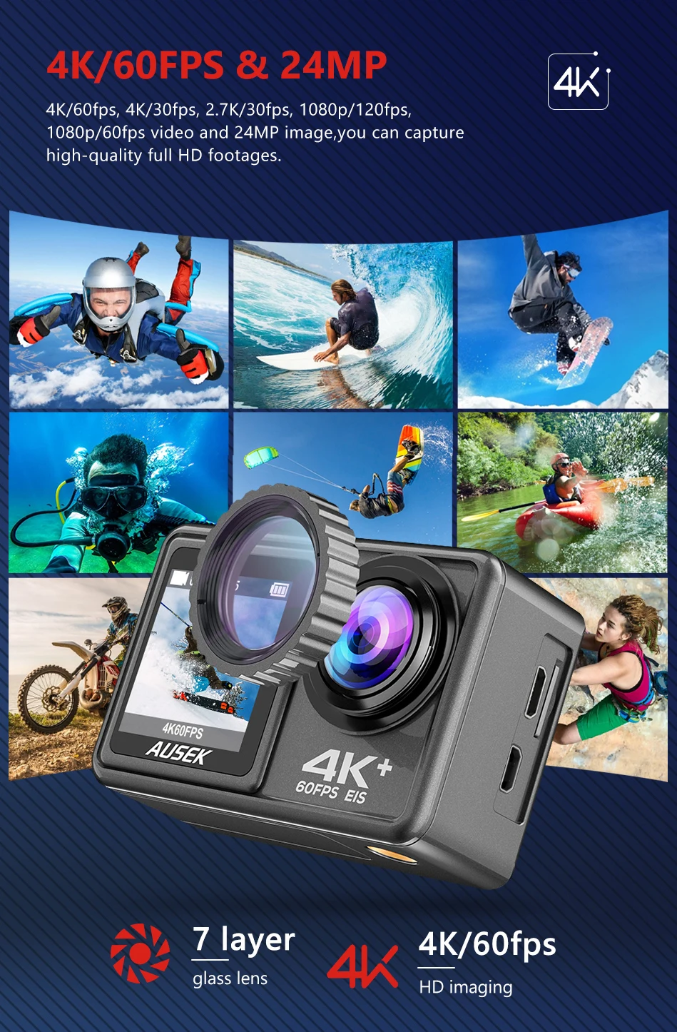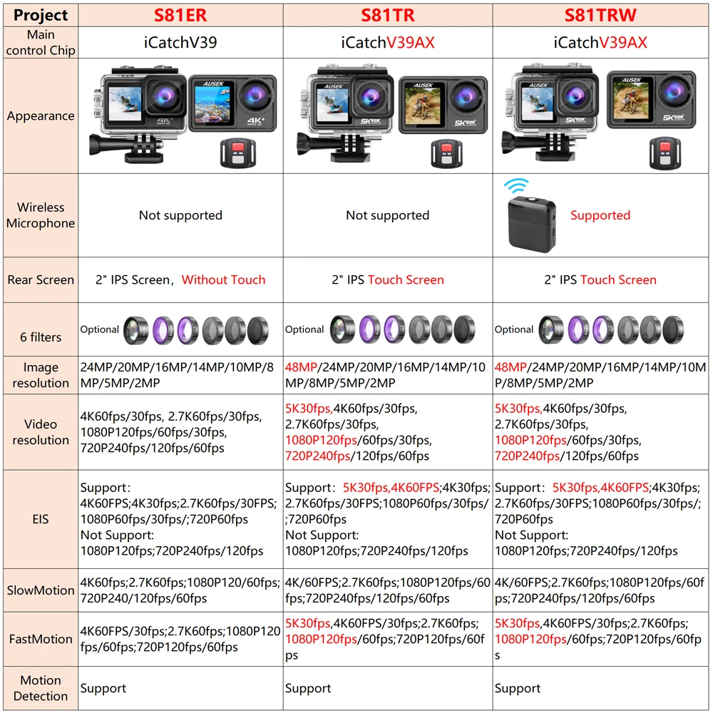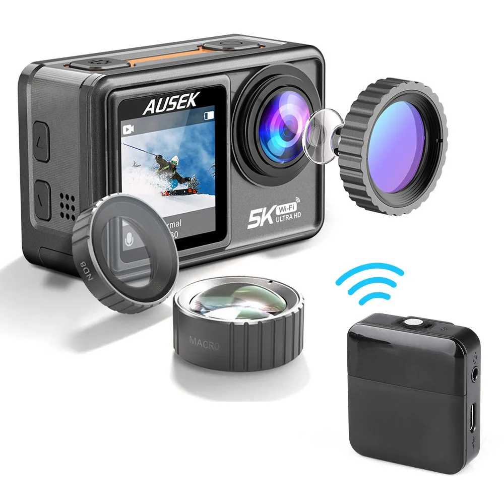 AUSEK S81TRW Action Camera 5K 4K60FPS 48MP DVR EIS With Optional Filters 5X Zoom 1080P Webcam Vlog Wi-Fi Sports Cam With Remote