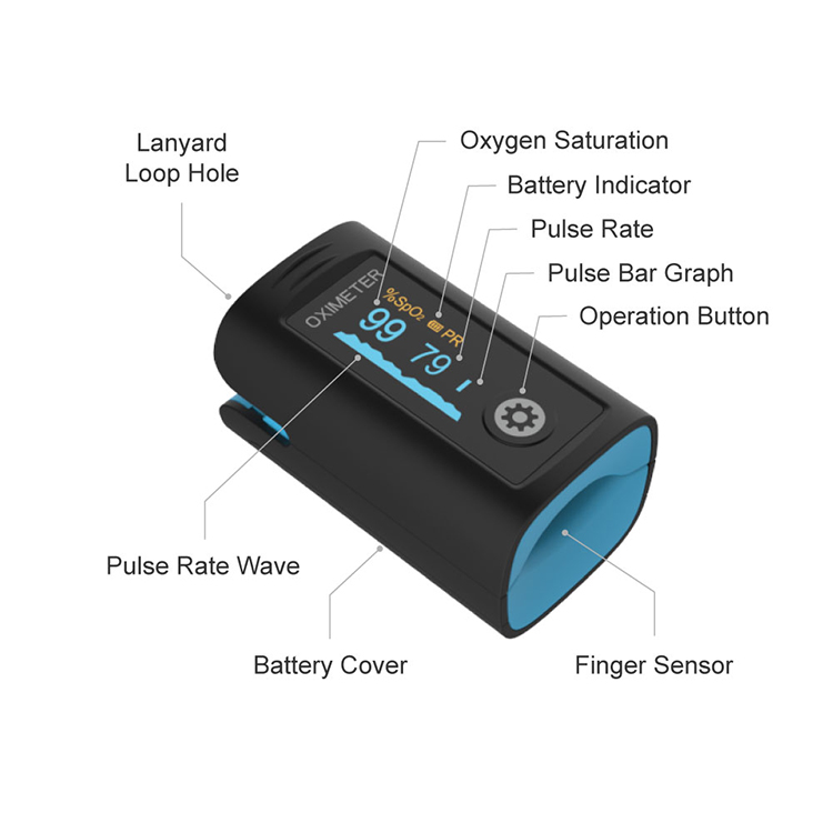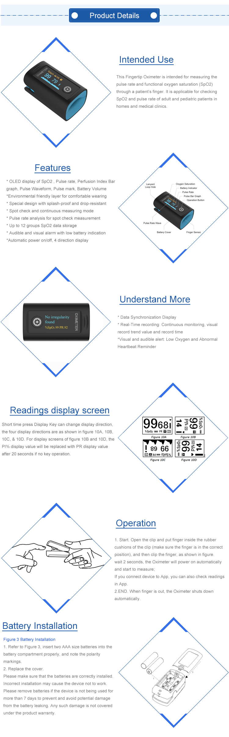Bluetooth Finger Pulse Oxygenation Monitor Alarms Blood Oxygen Heart Rate PI PR Storage Log Data Continuous Monitoring