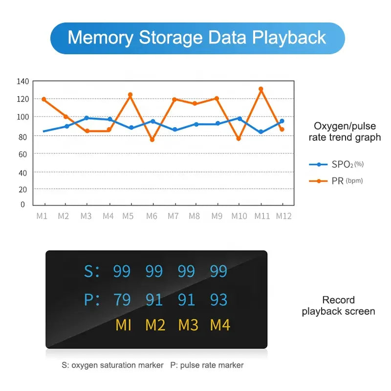 Bluetooth Finger Pulse Oxygenation Monitor Alarms Blood Oxygen Heart Rate PI PR Storage Log Data Continuous Monitoring