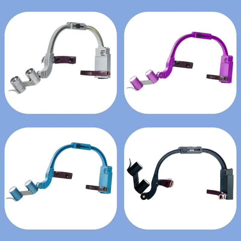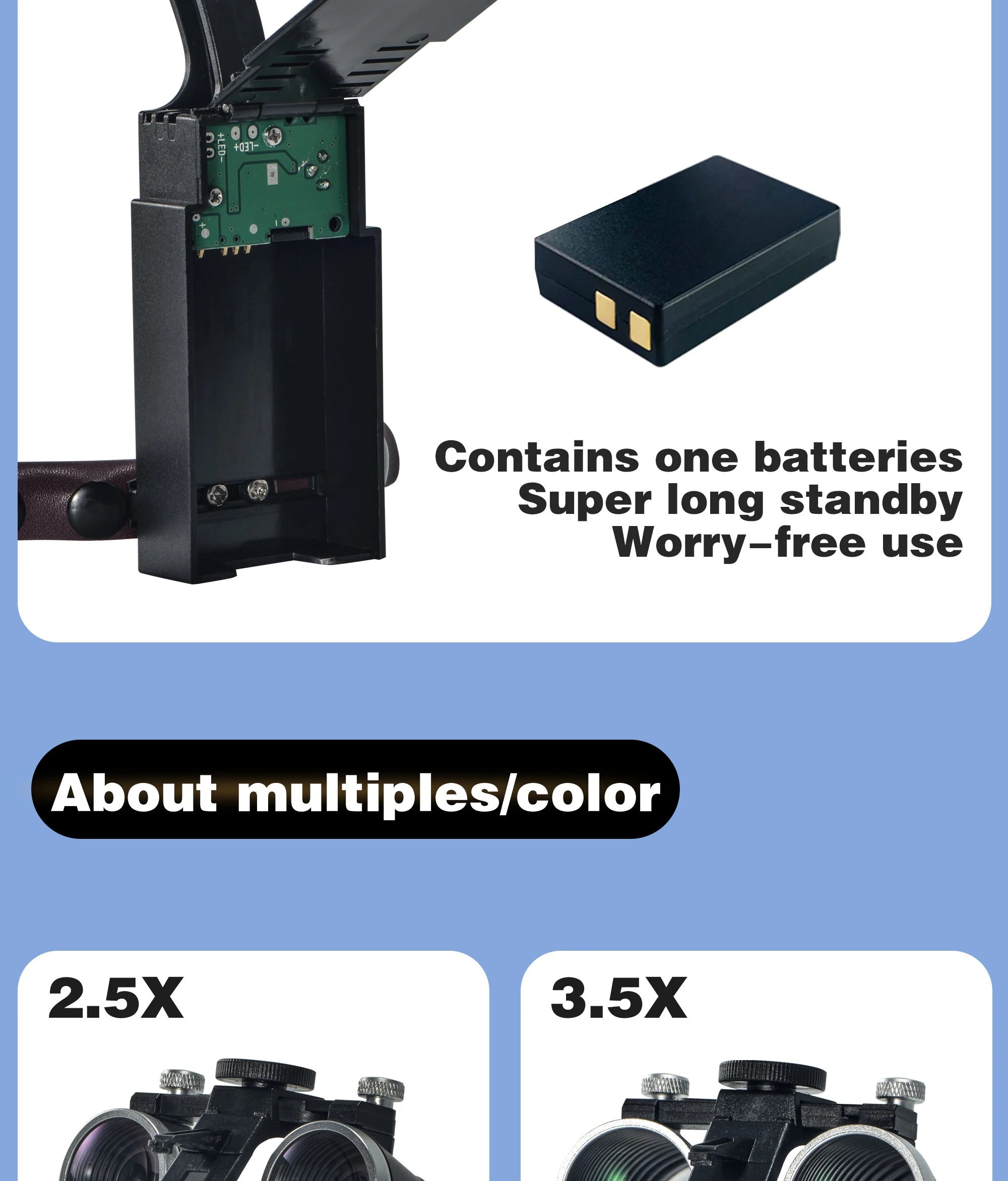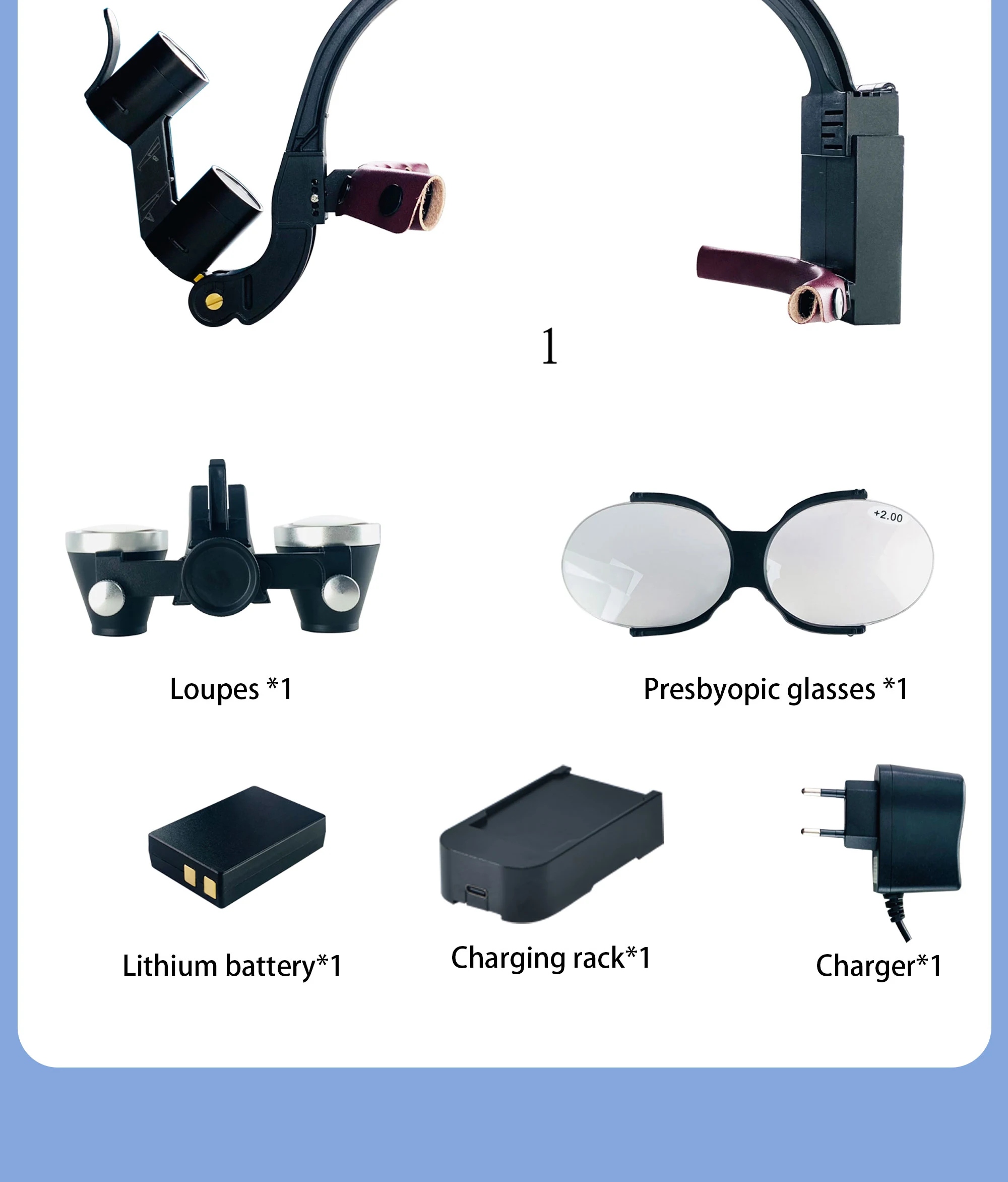 We highly recommend this head-mounted binocular dental loupe with wireless LED headlight for it is more convenient to work with. No wire ,no mess.