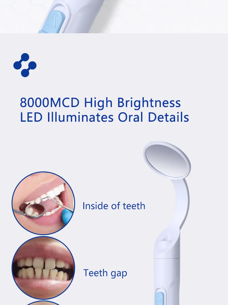 2.Easy to operate: the oral dental mirror is designed with switch button for easy operation, and the non-slip handle bring you a comfortable grasp, lightweight and portable, it is an useful oral care tool to inspect your teeth condition.