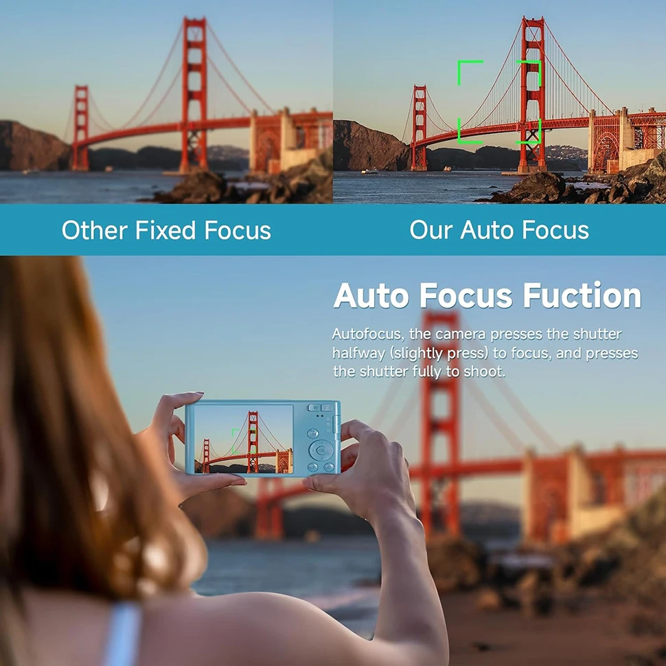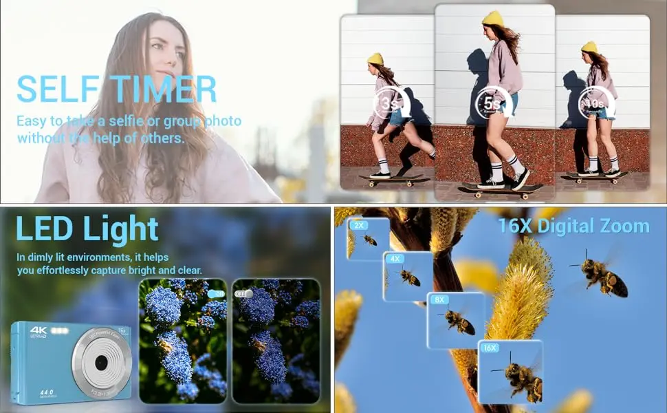 Digital Camera Suitable for Live Streaming When you connect the data cable between our digital camera and computer, the camera screen will display three modes: USB Mode, PCC Camera, and Charging Mode. If you have live streaming requirements, you can choose the PCC Camera mode. This way, the display on the computer will be clearer compared to using the computer's built-in camera for live streaming. 4K Ultra HD Pixels for The Utmost Visual Experience With 4K FHD video resolution and 44 MP photo pixels, this digital camera 4K ensures high-quality image clarity. And our high-definition digital camera also features automatic focus, eliminating the need for manual adjustment, allowing you to effortlessly capture crisp images. Self-timer Function When you want to take a group photo with others or capture a self-portrait, you can set a delay on the digital camera. We offer options of 3s, 5s and 10s for you to choose from. This allows you to take photos without needing to seek assistance from others. LED Light This metallic digital camera is equipped with three LED bulbs. When shooting in low-light conditions, turning on the flash will result in clearer and brighter photos. 16X Digital Zoom The digital camera for teens supports 16X digital zoom, you can use the W/T button to zoom in or out on the image. Excellent zoom technology allows you to capture more detailed scenes.