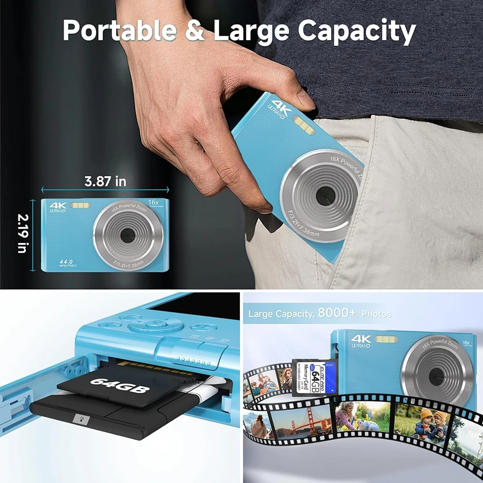 【FHD 4K & 44MP】With 4K FHD video resolution and 44 MP photo pixels, this purple digital camera 4k ensures high-quality image clarity. The point and shoot camera is equipped with an enlarged 2.8 inch Ultra HD display screen, which is convenient for taking photos and watching videos.Supports up to 256GB TF cards, record the beautiful moments and Provides large storage capacity. 【16X Digital Zoom & Multifuntional】The digital camera for teens supports 16x digital zoom, you can use the W/T button to zoom in or out on the image. With features like self-timer, continuous shooting, time-lapse, webcam, filters and scene modes etc. This digital camera fhd point and shoot camera lets you unleash your creativity and take photos that stand out. 【Vlogging Webcam & Pause Function】This digital camera with video can also be used as a webcam, so you can make video calls or live stream on social media. The pause function allows you to pause when recording or seeing playback videos. And the built-in fill light helps you to take quality pictures in the dark. Included USB cable support transferring photos and videos from the camera to ur computer for timely photo collection and storage. 【Mini & Easy to Use Camera】This small digital camera measures 3.87*2.19in and can be carried in your carry-on pocket or bag. The camera is simple to set up and easy to operate, just press the button to capture the moment. Comes with a lanyard for easy portability and mobility. Equipped with 1 rechargeable batteries and an auto shut-off setting, there's no need to worry about running out of power, perfect for holiday trips and camping. 【Warranty & More Accessories】We provide a one-year satisfaction warranty, along with a no-hassle replacement policy, any problem or question with the camera, please contact us for help. Items Include: Digital camera x 1; Rechargeable Li-ion battery x1,Card reader x1,USB data cable x1, waterproof bag x1, hanging rope x1, instruction manual x1