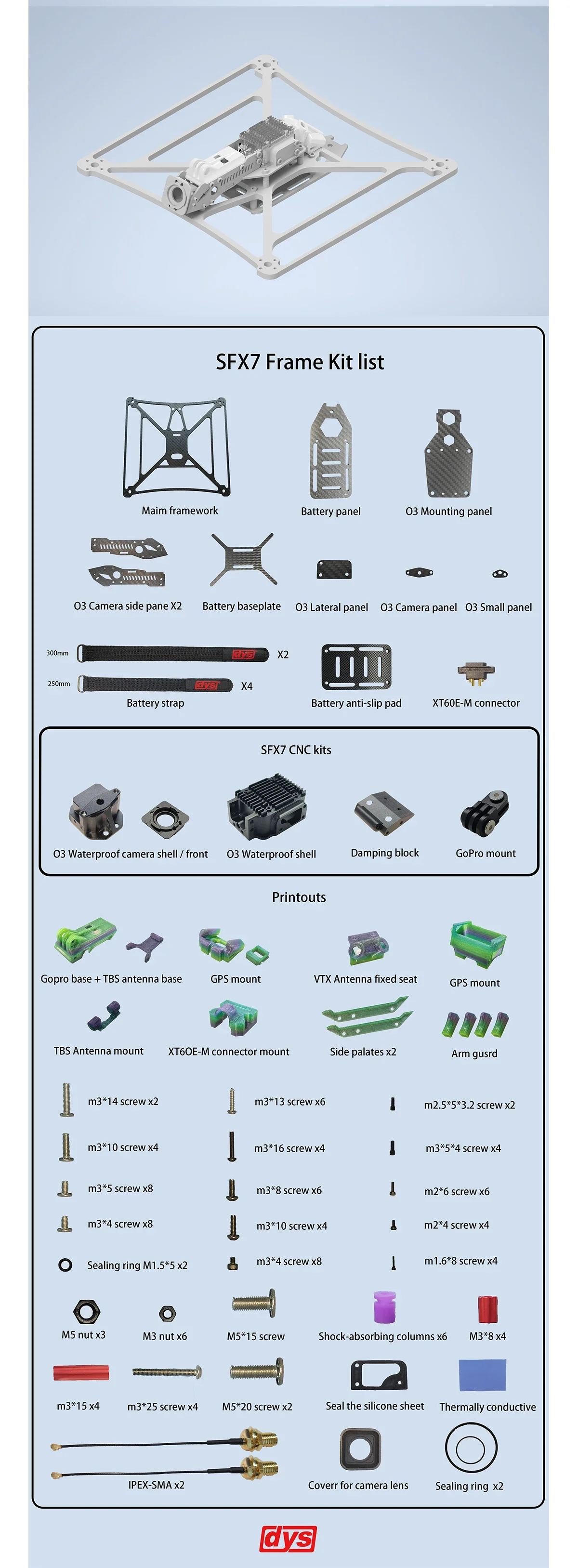 DYS Osprey SX7V1 is a type drone with 7 inch waterproof longrange frame, made in super-stiff carbon fibre for minimum resonance, and recommended 2807 motors for maximum 7" prop control.