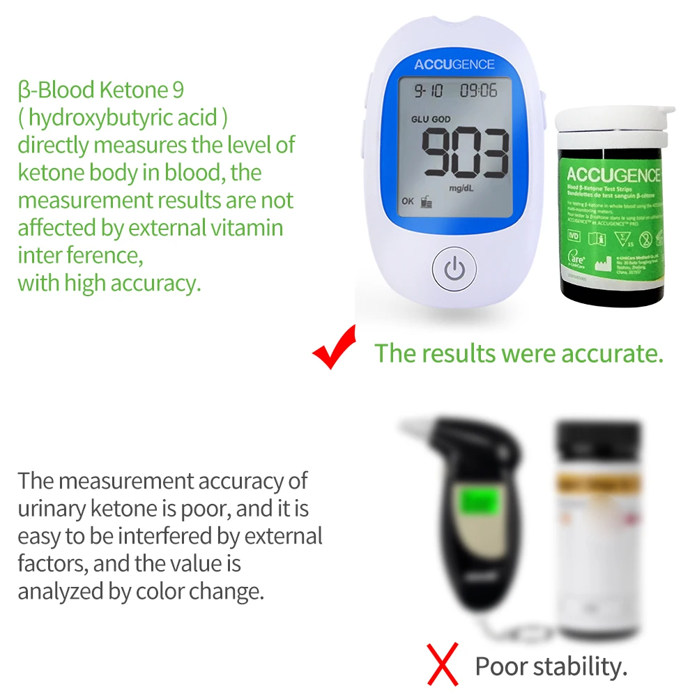 Why choose a blood ketone monitor?Measure β-Ketone, the predominant ketone (Often refers as gold standard) in keto diet and DKA,Measure current plasma ketone concentration,allowing diagnostic certainty and subsequent management plan for keto diet.