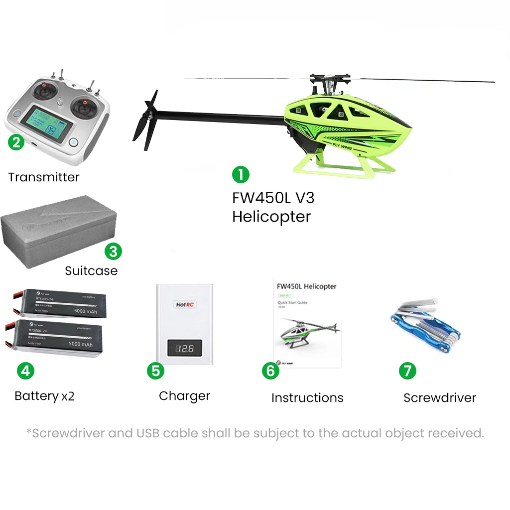 FW 450L-V3 has a superior design and is equipped with high-quality hardware. With the flybarless system, a brushless motor, and a solid carbon fiber frame, this 6CH helicopter has everything ready for you to immerse yourself in an excellent flight!