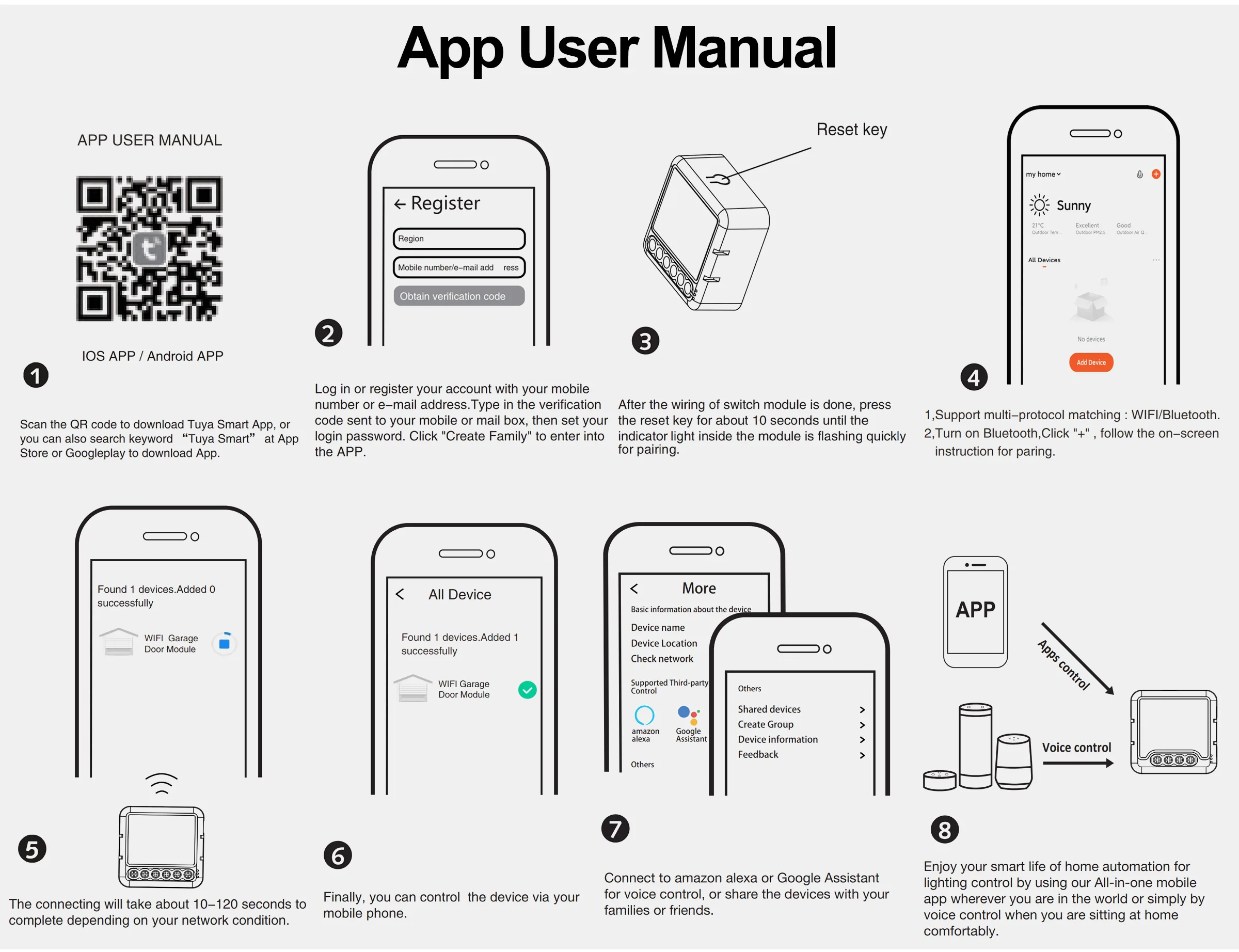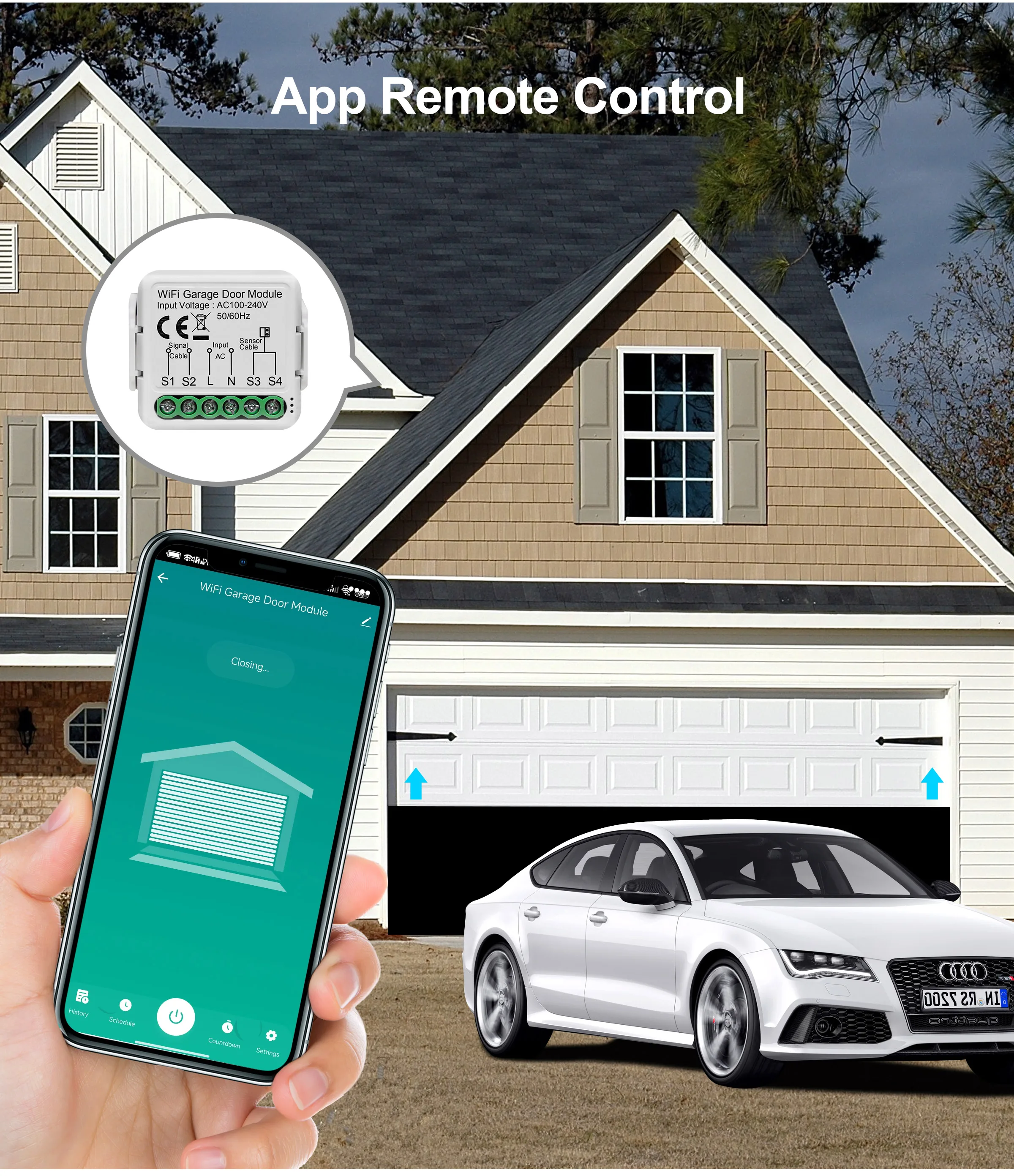 With this smart garage door module, you can remote control and voice control your garage door. Don't need to open/close the door repeatedly.Free your hands,letting your life smarter.