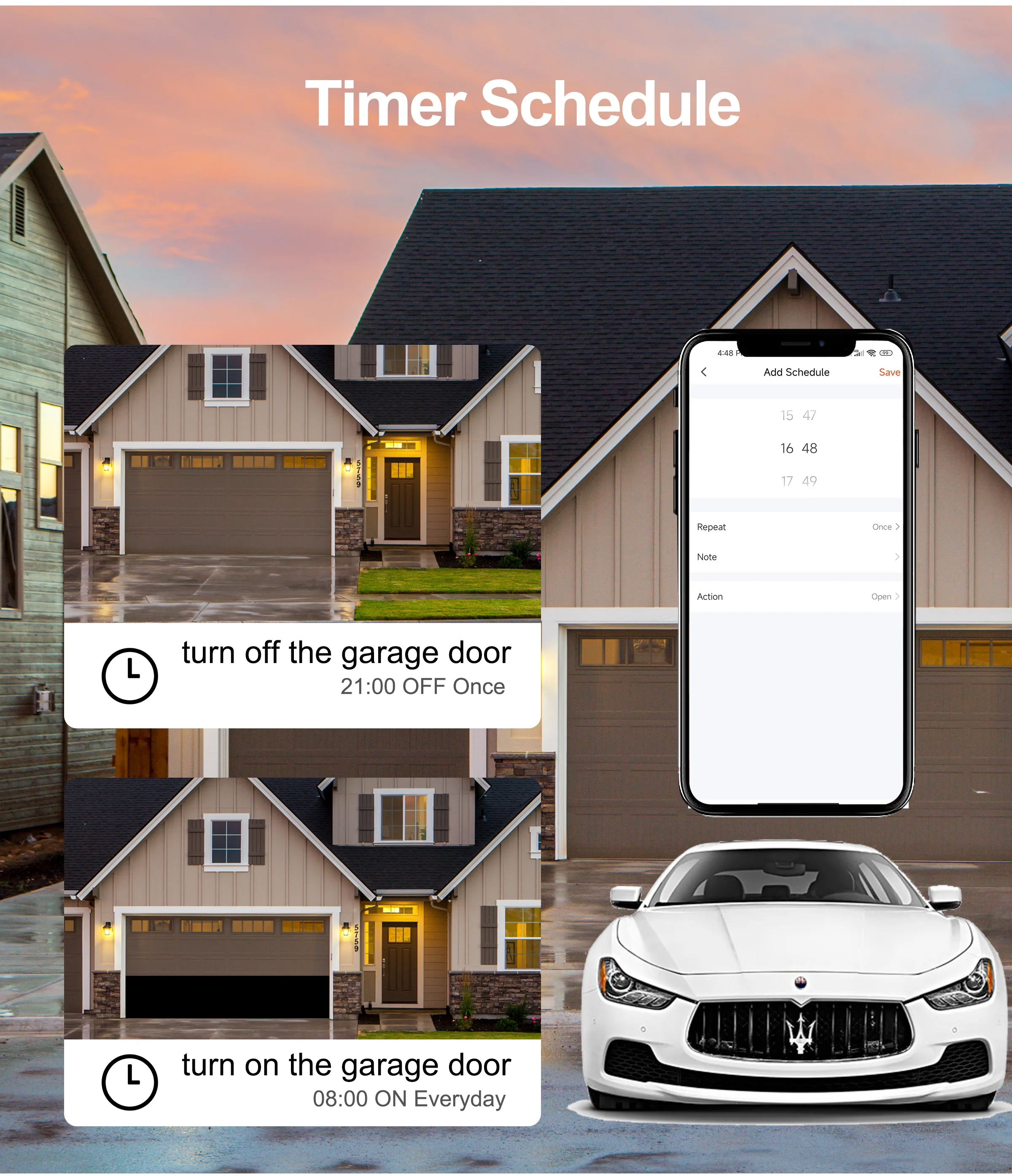 A suitable timer can be set to trigger the garage door open/close according to your needs for going out or going home,creating a more smarter life by yourself with the smart garage door opener.