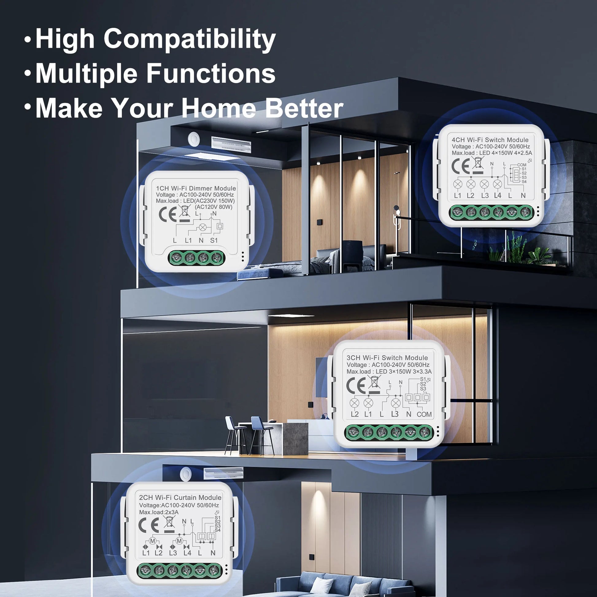 No need to replace all your existing switches; simply install our compact modules behind them and transform your home into a smart haven. From there, effortlessly control your lights, dimmer bulbs, and curtains using TuyaSmart/Smart Life app, voice assistants like Alexa/Hey Google, and timer settings. Experience the convenience of smart living today.