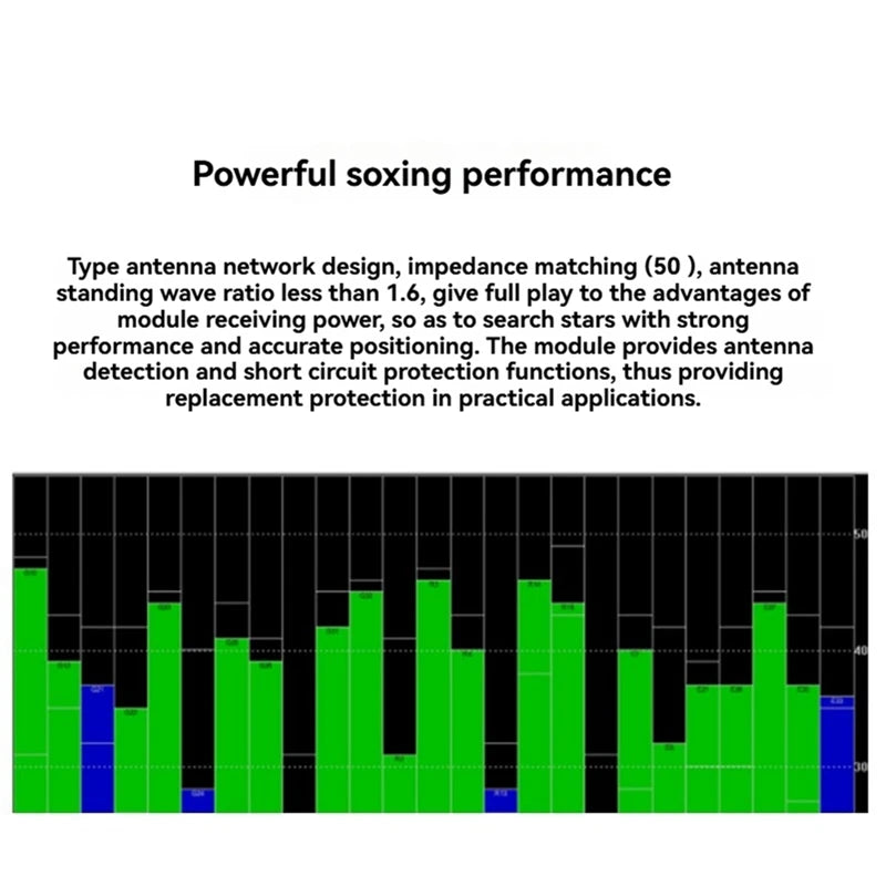 Powerful satellite search performance: Strong satellite search performance and accurate positioning. The module provides antenna detection and short-circuit protection functions inside, so that in actual applications, it can be replaced