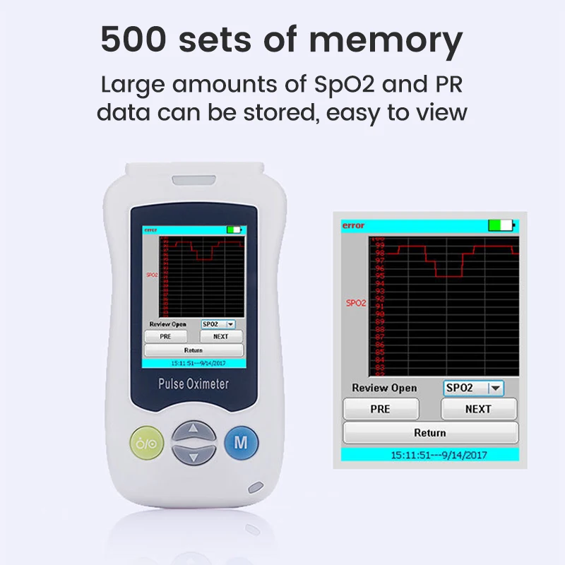 It can store the latest 500 sets of data. Review function can select data in SpO2 or PR. Trend function can show the overall data changes in SpO2 and PR.