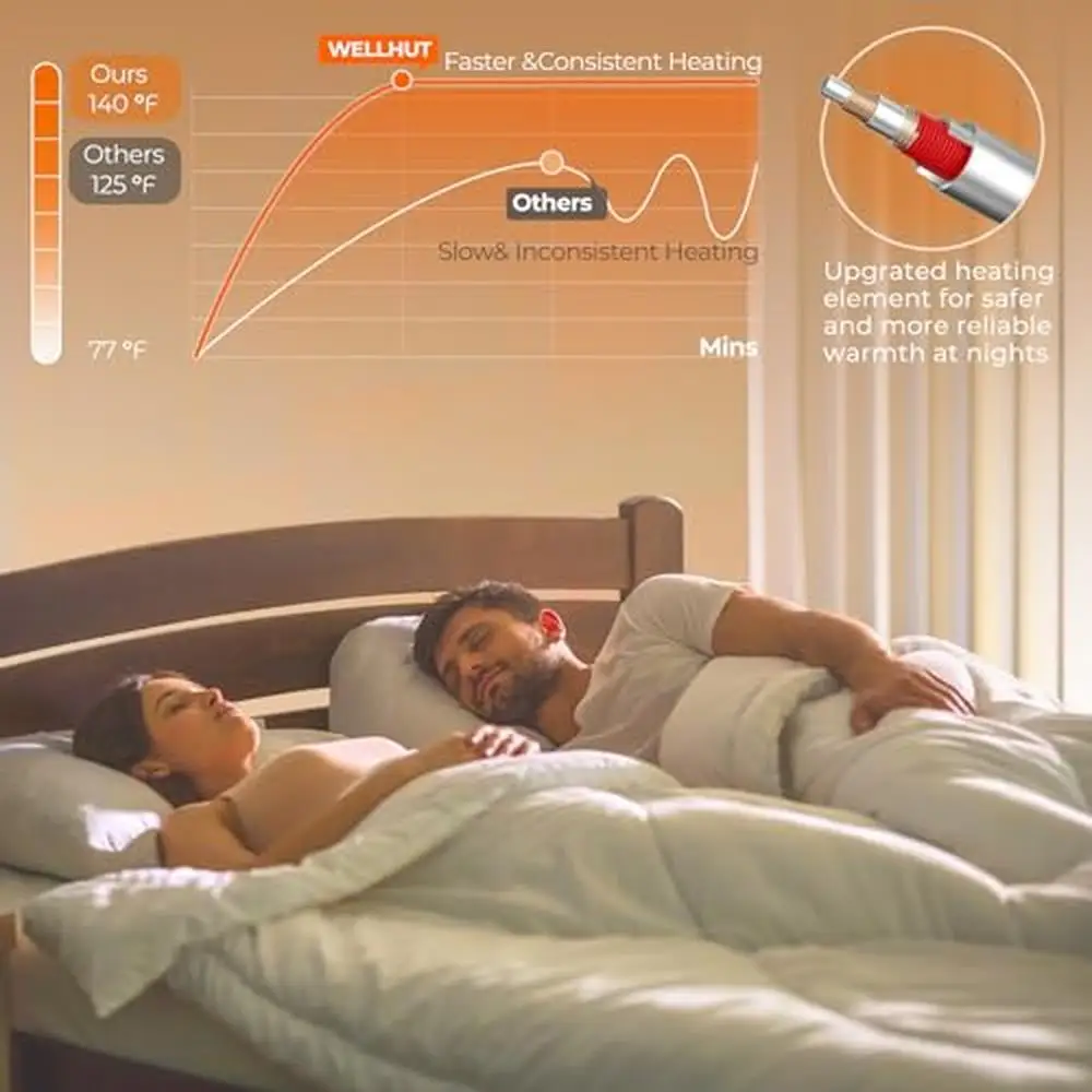 『Toasty Bed Warmer』Made of stretchier, soft, breathable Polyester, WELLHUT heating pad delivers steady heat with soft touch to enhance luxurious sleeping experience, cozy up your night while brings benefits of pain and aches relief, reduced trait anxiety and depression.