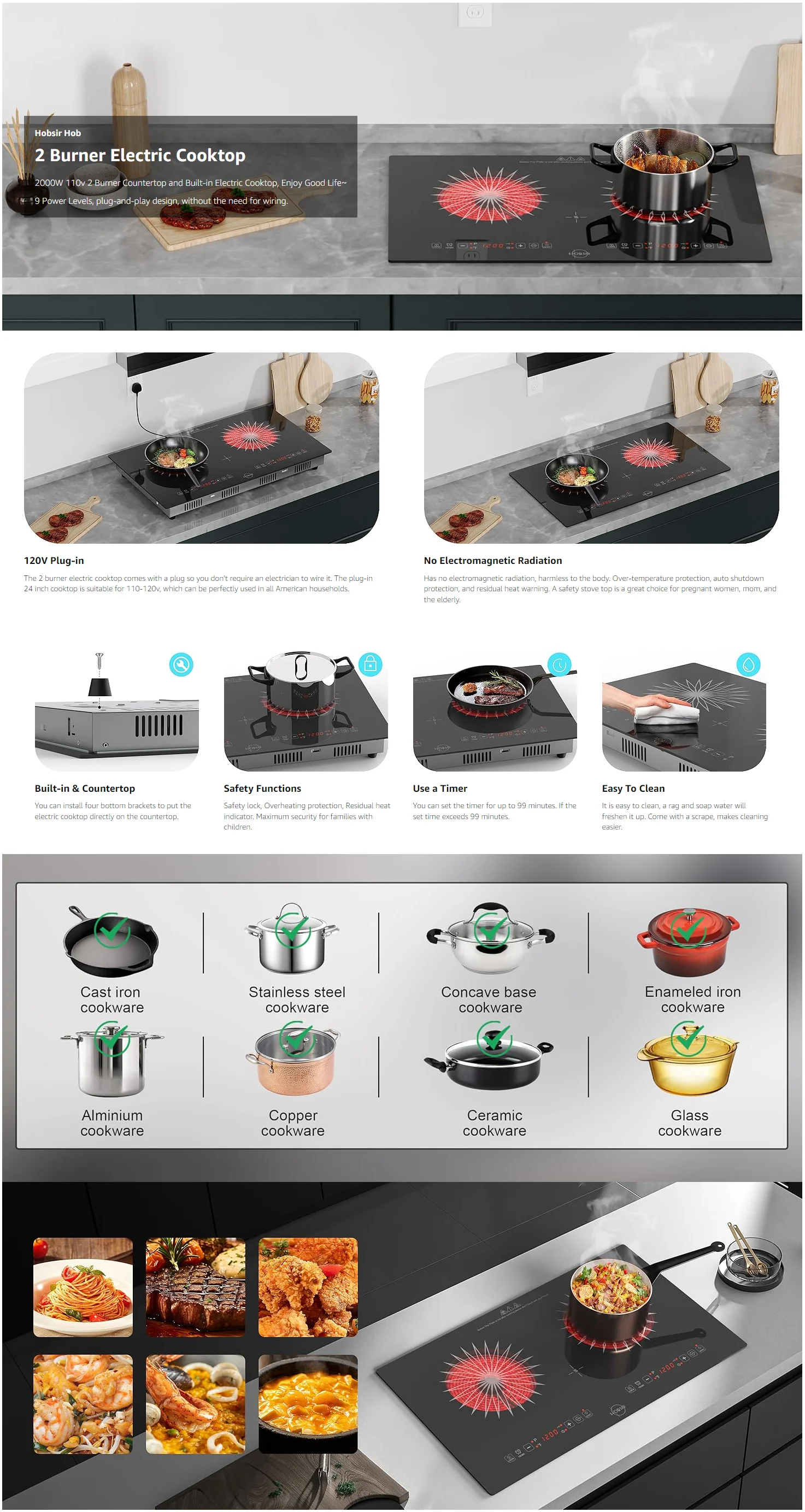 Hobsir Hob 2 Burner Built-in Electric Cooktop 24 Inch,110V-120V,Timer,Safety Lock for Apartment,with Plug
