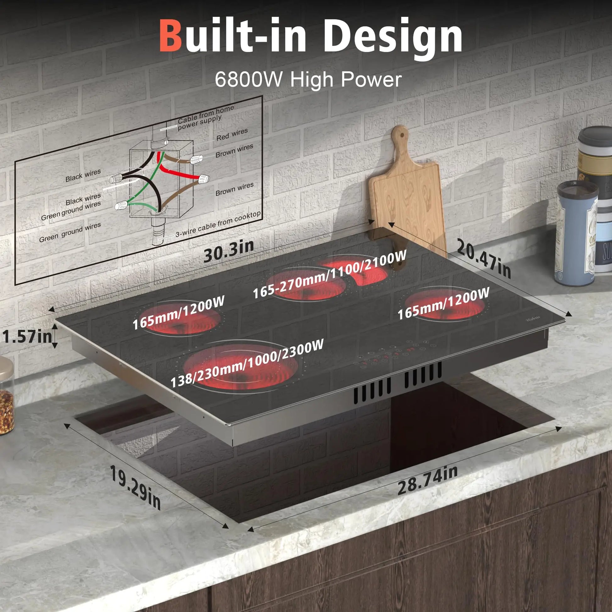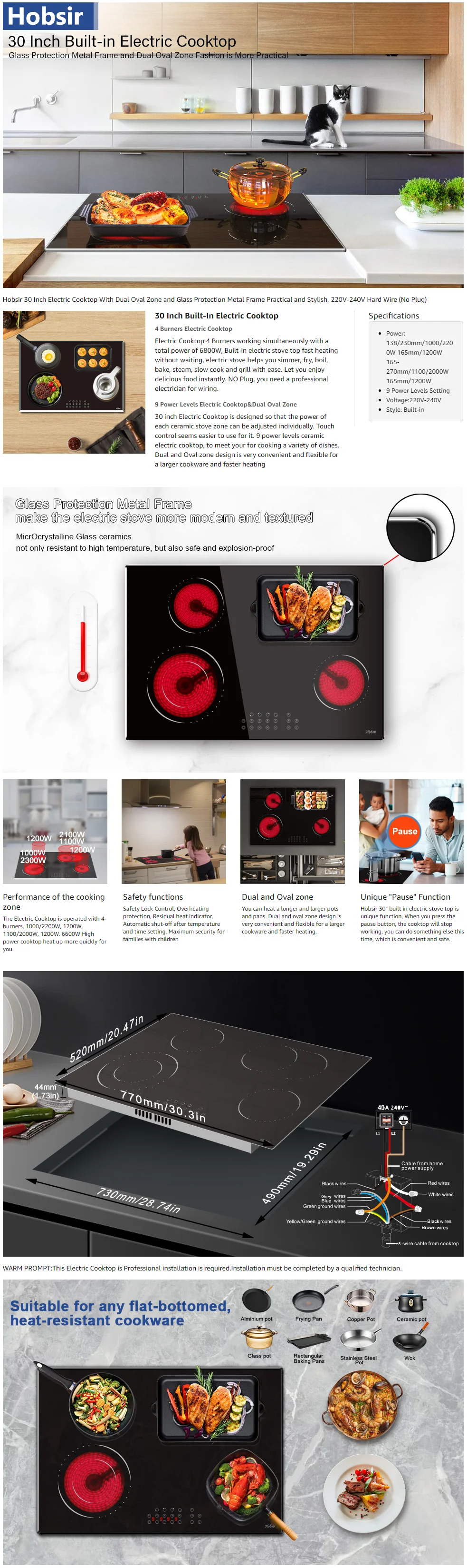 Hobsir hob 30 Inch 4 Burner Built-in Electric Cooktop,6800W,with Dual Oval Zone,Glass Protection Metal Frame,220V-240V Hard Wire