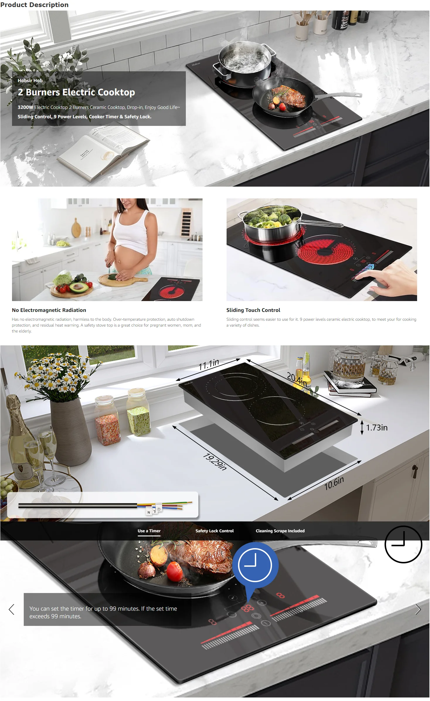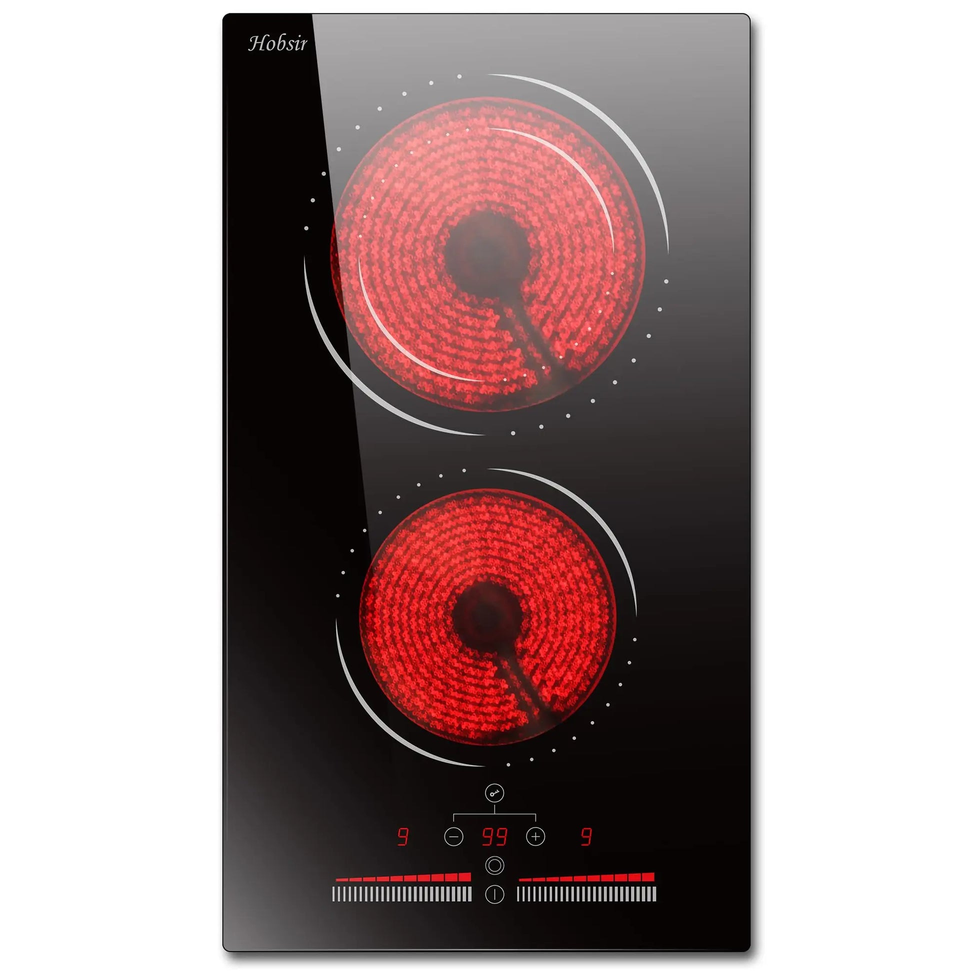 Hobsir hob Built-in 12 inch 2 Burners Electric Cooktop, with Sliding Control,Timer,Safety Lock, Power Levels 3200W,220V-240V