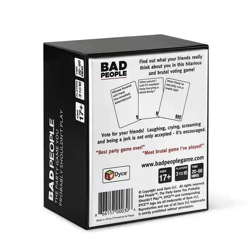 >VOTING FOR YOUR FRIENDS IS HILARIOUS AND YOU CAN PLAY BAD PEOPLE 1000's OF TIMES: The game play changes each time based on who you are playing with. Ages: 17+ adults only, Time: 20-60 Minutes, Players: 3-10