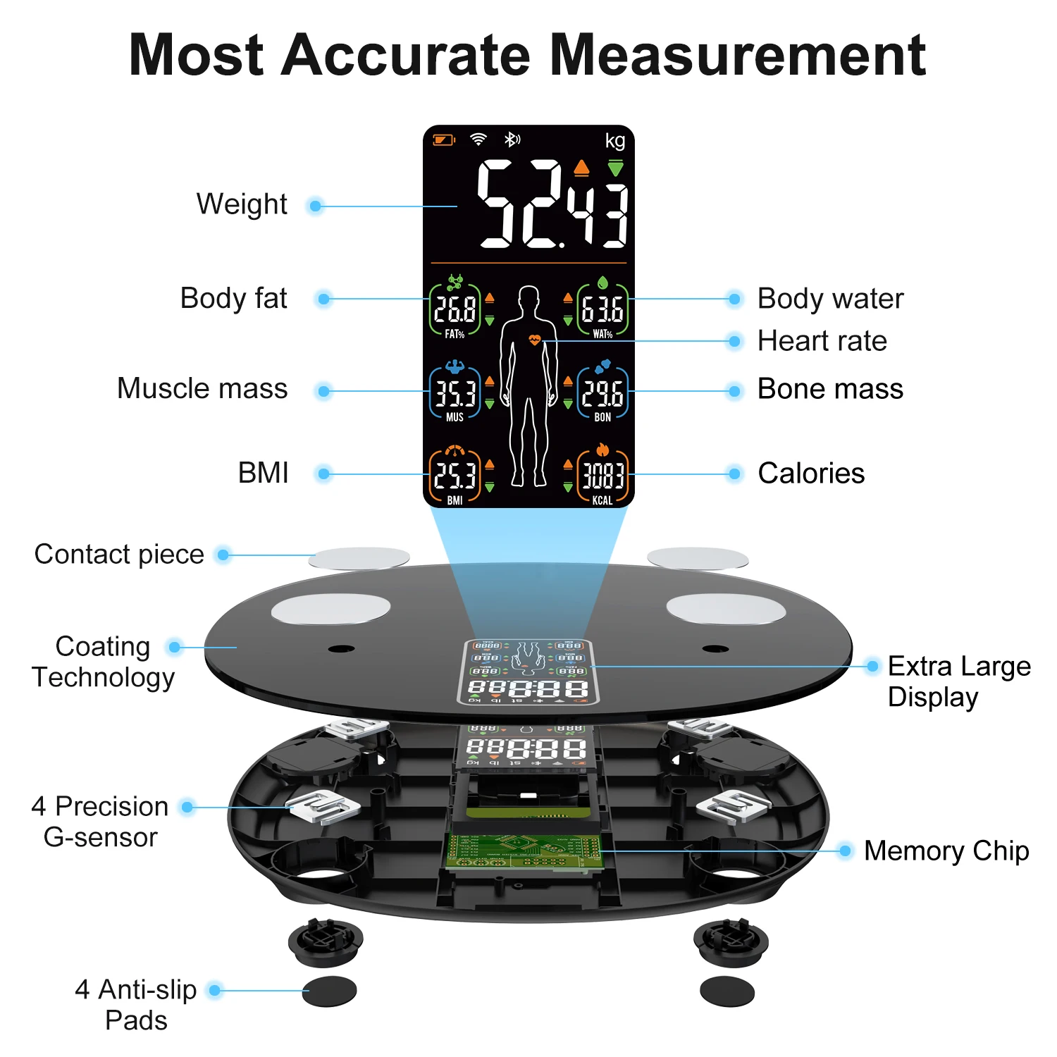 Weight, Body Fat, BMI, Body Water, Muscle Mass, Heart Rate, Calories and Bone Mass