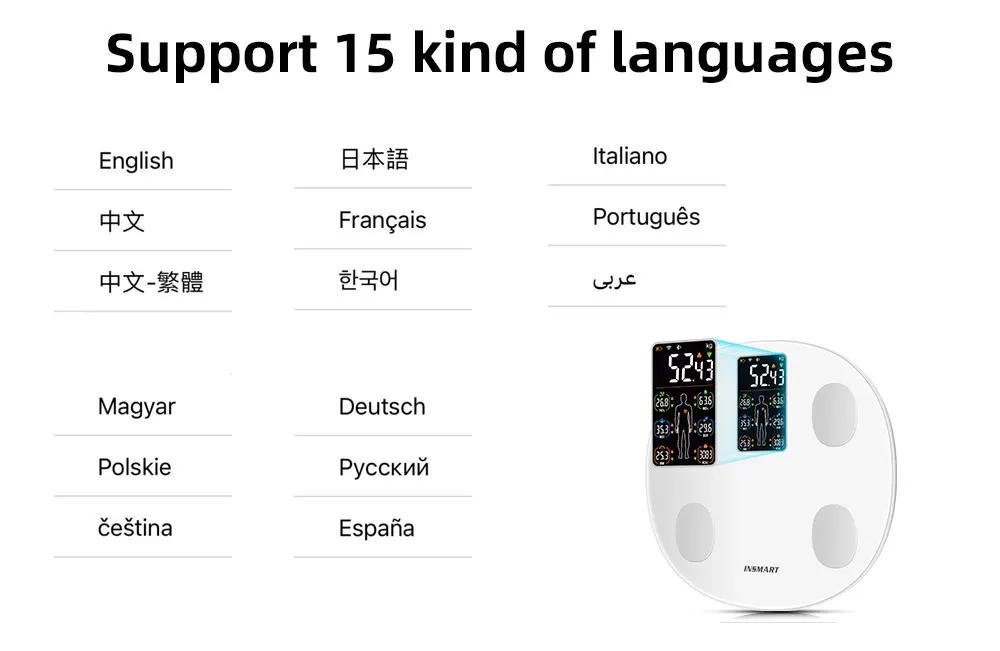 • Track other 9 body data on the "INSAMRT Health" APP: Heart index, Lean body mass, Skeletal muscle rate, Protein amount, Basal metabolism, Body age, Fat mass, Water content, Obesity level