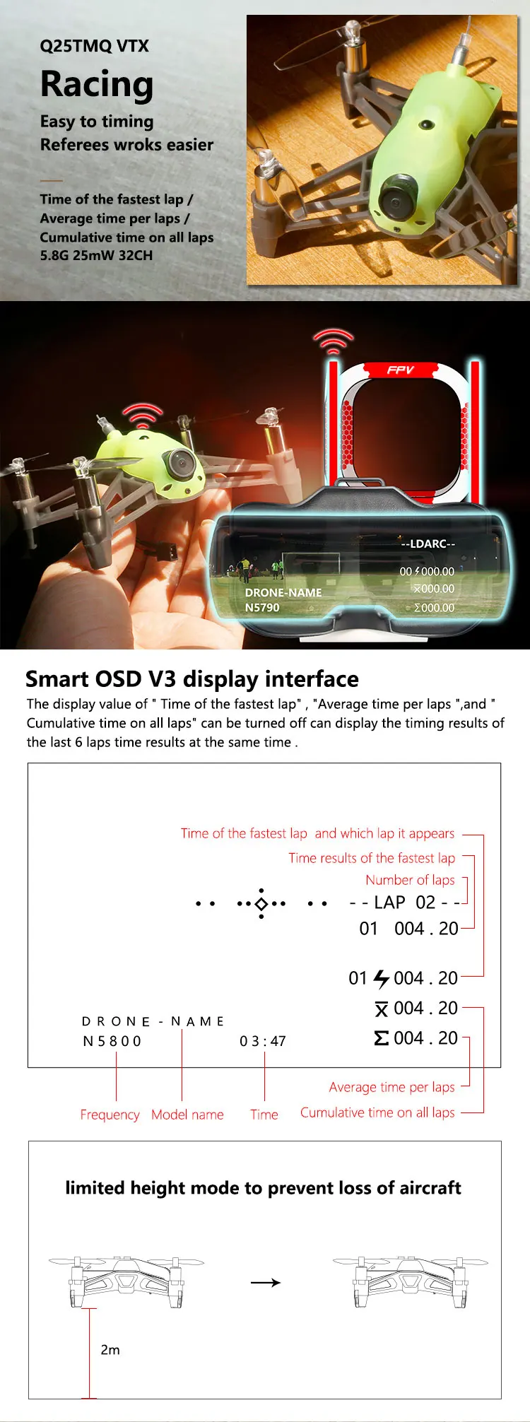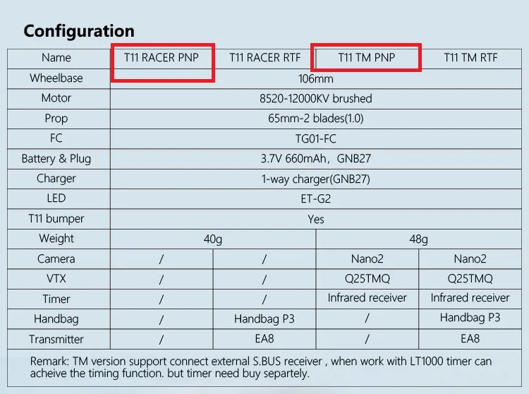 TM Version: Include VTX and camera, support FPV flight and Timing function.