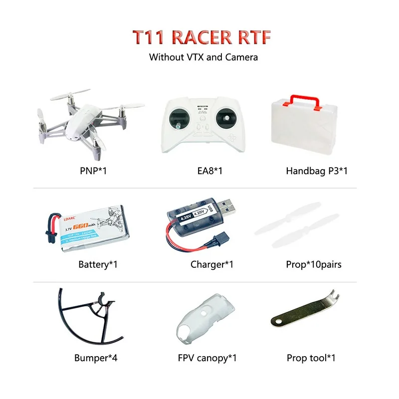 Racer RTF version: BNF*1(receiver install in the drone) + Battery *1+charger *1+ prop *10pairs +bumper *4 pcs +FPV canopy *1 + prop Tool *1 + Handbag