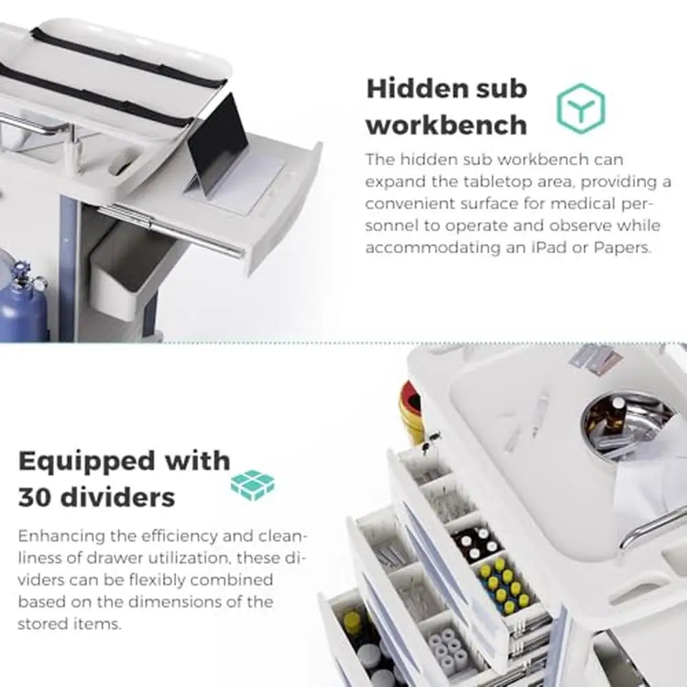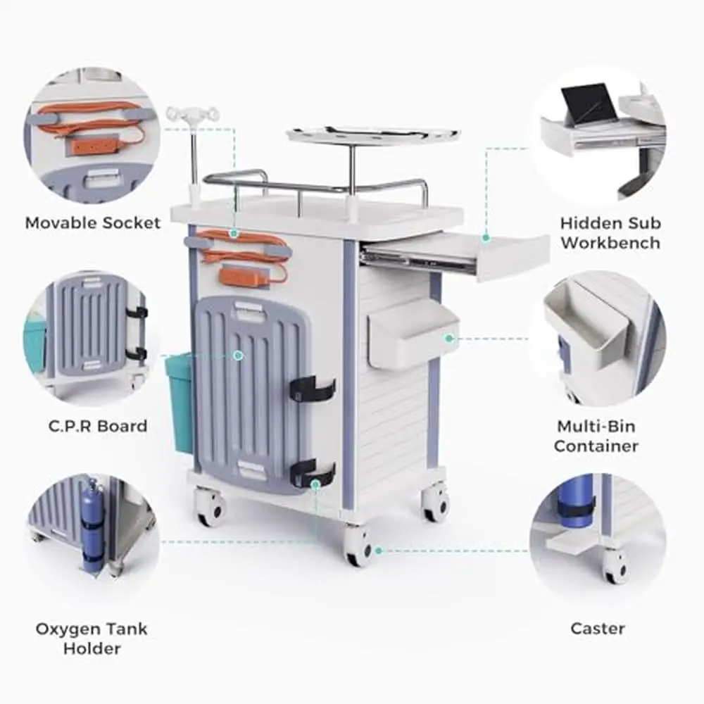 The medical trolley cart is equipped with a concealed C. P. R board for quick access during emergencies. It also features a retractable oxygen cylinder holder secured with straps to ensure stability during movement. Furthermore, the rear power cord storage bin is designed for convenient management and use. These key enhancements not only improve medical staff's ability to respond to emergencies but also provide a safer and more effective treatment environment for patients.