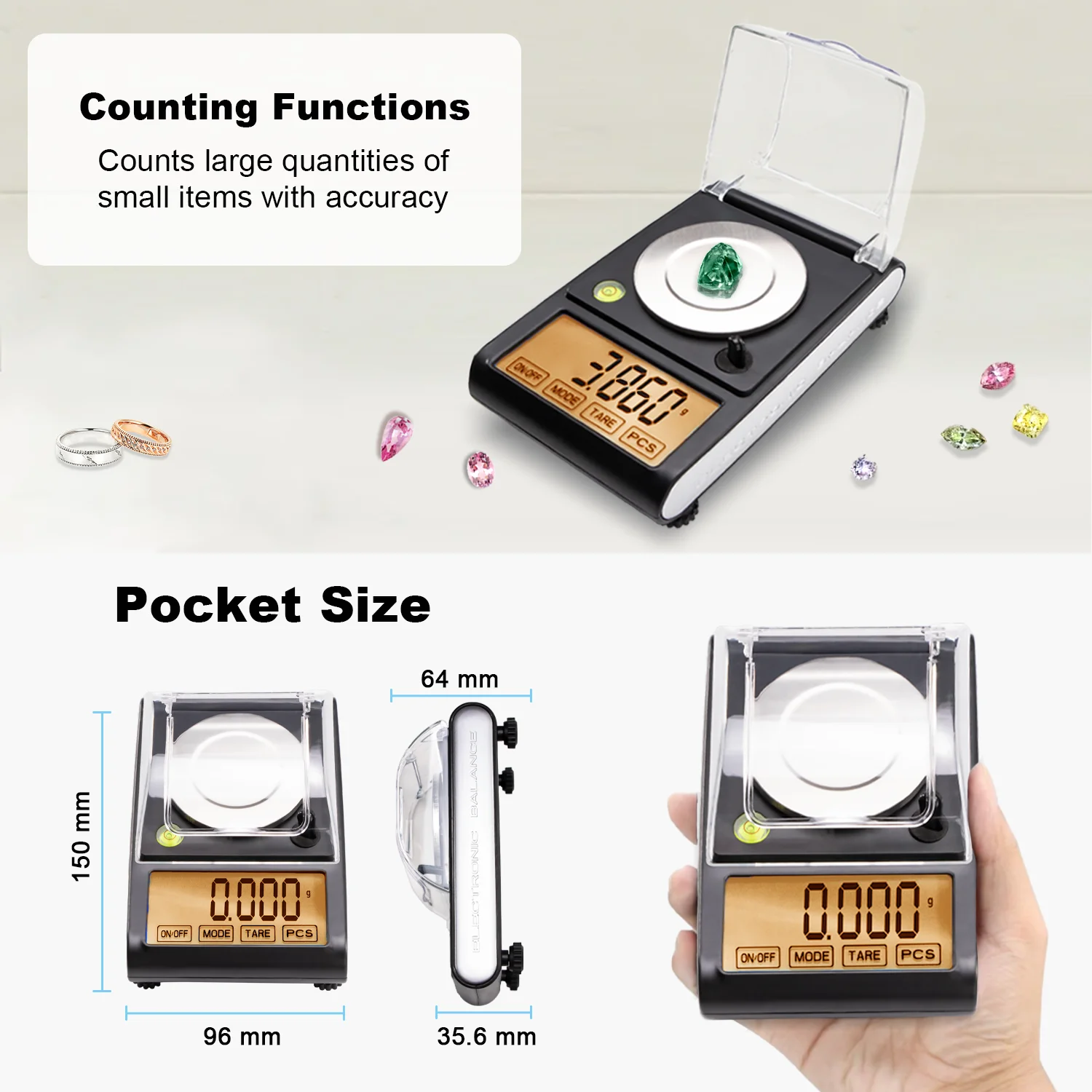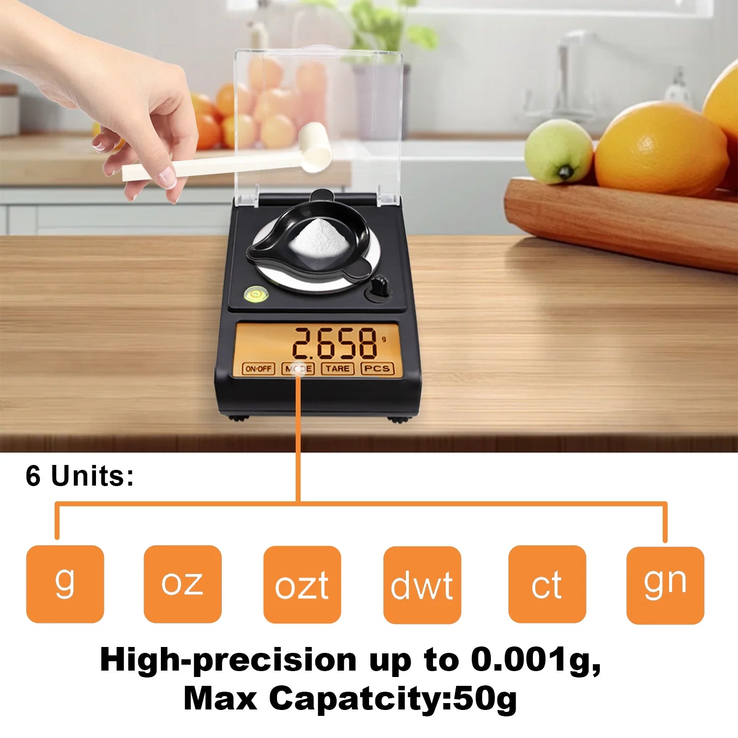 【Guaranteed Accuracy】Milligram scale built-in high-precision sensors, the maximum range of 50g, reading increments of 0.001g, accurate measurement of jewelry, gold, powders, medicines, herbs, coins and gemstones, and other small items, but also according to the level of the bubble to adjust the feet to maintain the balance, to ensure that the measurement of a more accurate