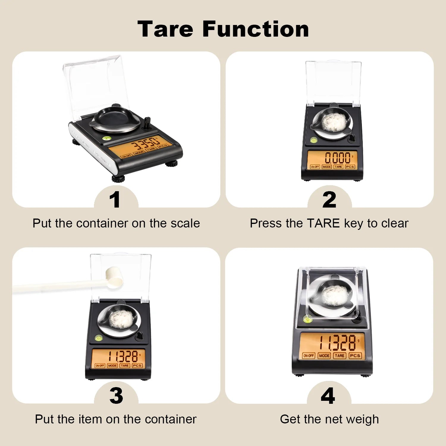 【Tare and Calibrate】The Tare key on the medicine scale allows you to subtract the weight of the container at the touch of a button, making it easy to obtain the exact net weight of your powder or jewelry. In addition, the included 50 grams of calibration weights make it easy to re-calibrate the micro scale, and the windproof cover prevents you from additional disturbances during the measurement of your jewelry or powders.
