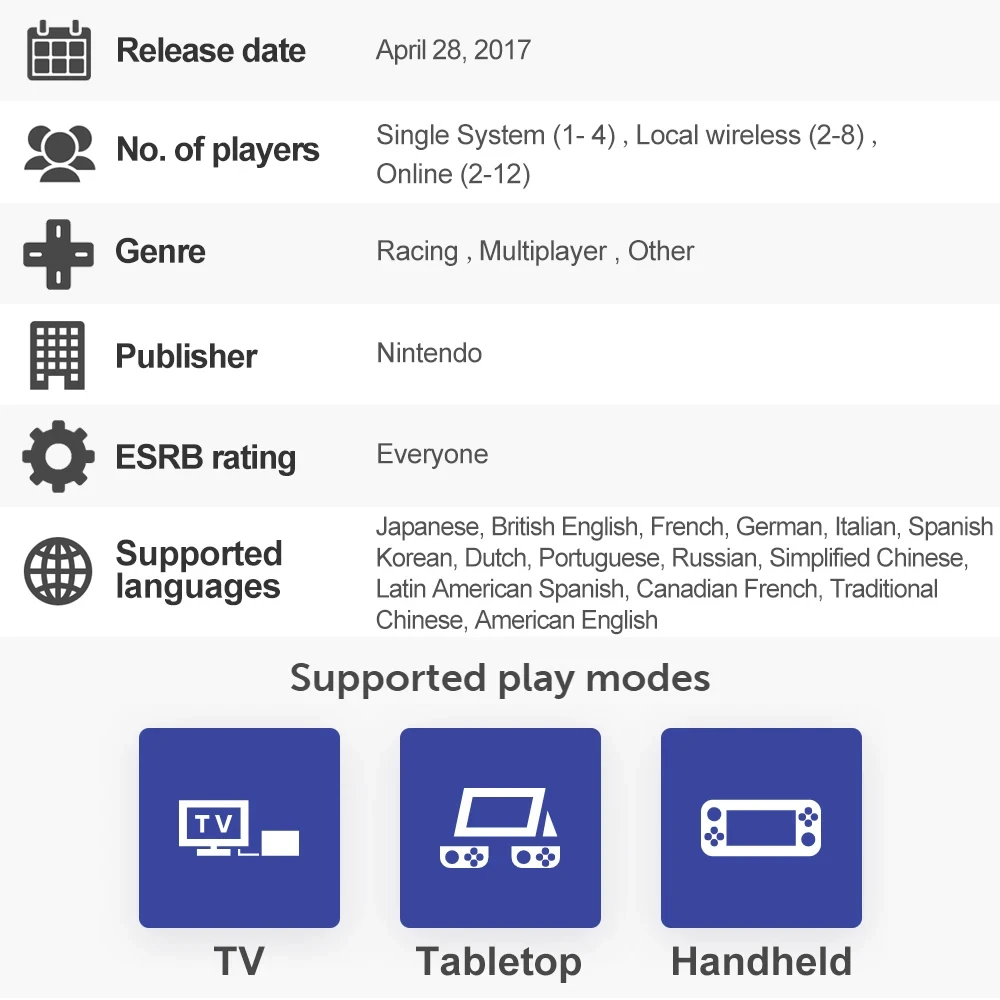 Hit the road with the definitive version of Mario Kart 8 and play anytime, anywhere! Race your friends or battle them in a revised battle mode on new and returning battle courses. Play locally in up to 4-player multiplayer in 1080p while playing in TV Mode. Every track from the Wii U version, including DLC, makes a glorious return. Plus, the Inklings appear as all-new guest characters, along with returning favorites, such as King Boo, Dry Bones, and Bowser Jr.!