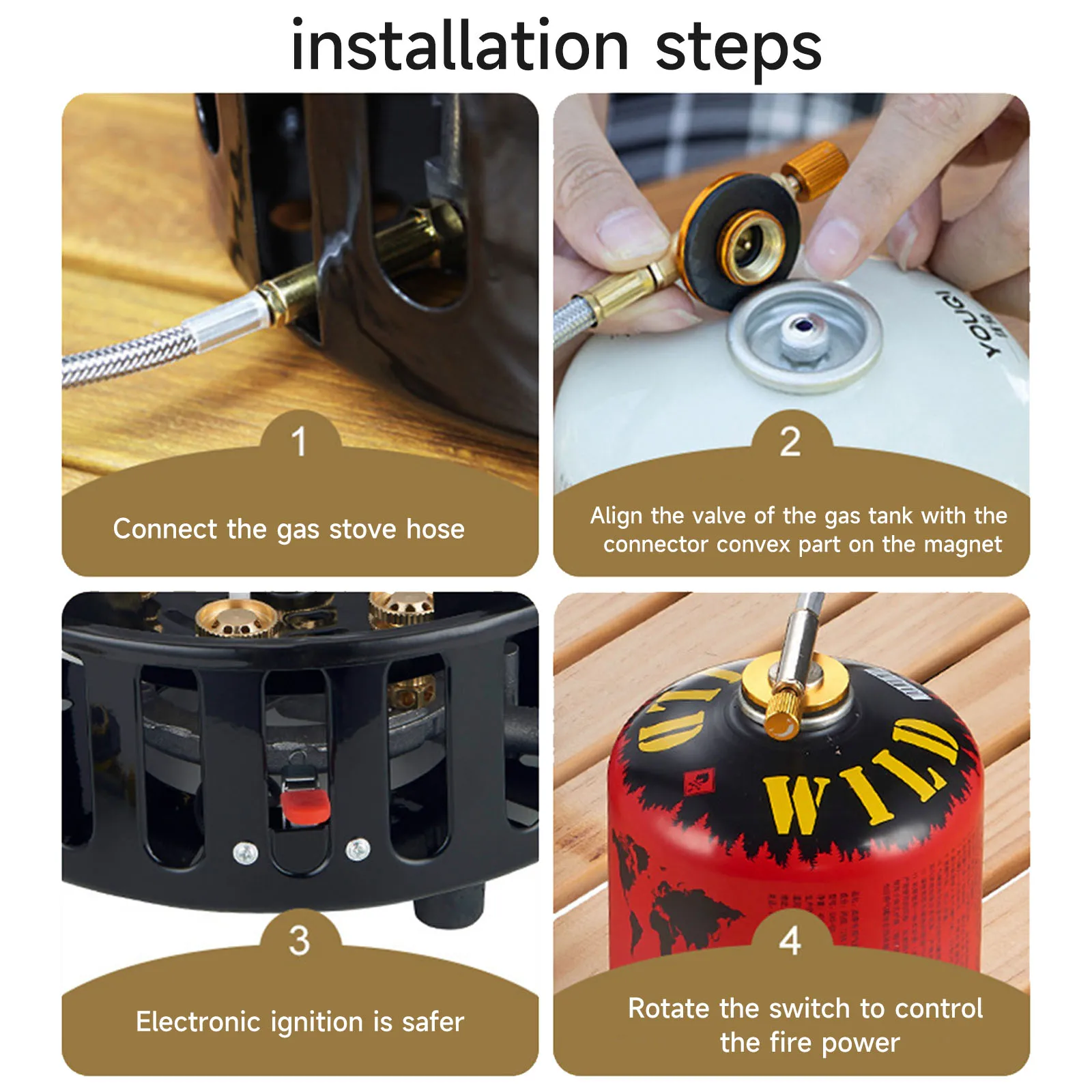 Three joints: Three joints design to meet the needs of different gas tanks, 7 fine copper fire holes, no additional windshield required.