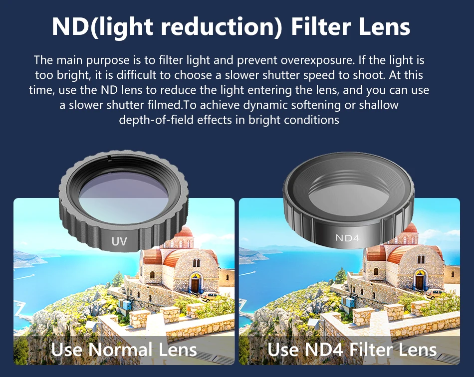 ■The main purpose is to filter light and prevent overexposure. If the light is too bright, it is difficult to choose a slower shutter speed to shoot. At this time, use the ND lens to reduce the light entering the lens, and you can use a slower shutter filmed.To achieve dynamic softening or shallow depth-of-field effects in bright conditions.