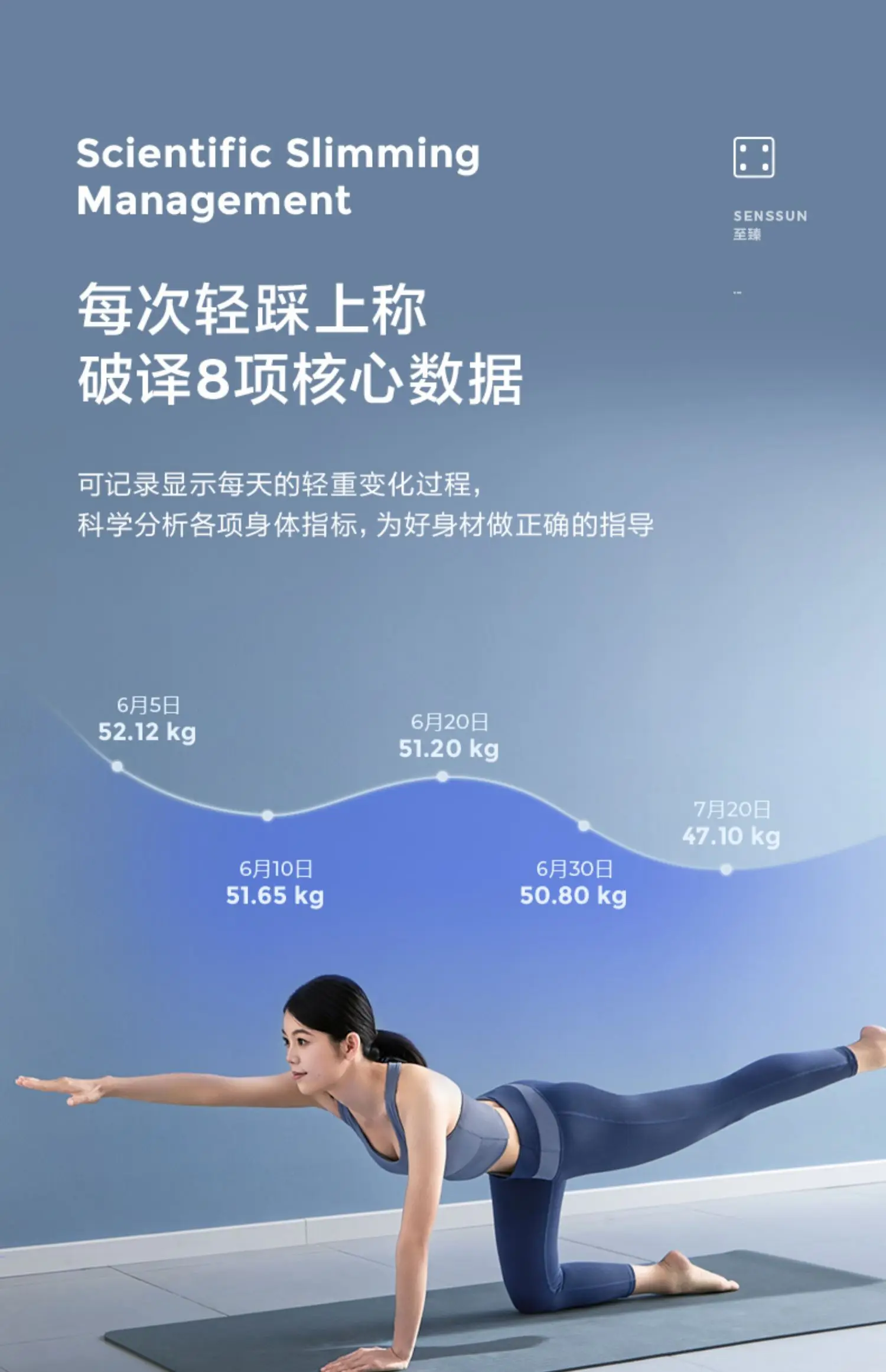 The Xiangshan Eight Electrode Weighing Scale supports intelligent interconnection and can be connected to mobile apps for data synchronization. You can check historical data at any time to understand your weight and body fat changes, providing strong basis for health planning.