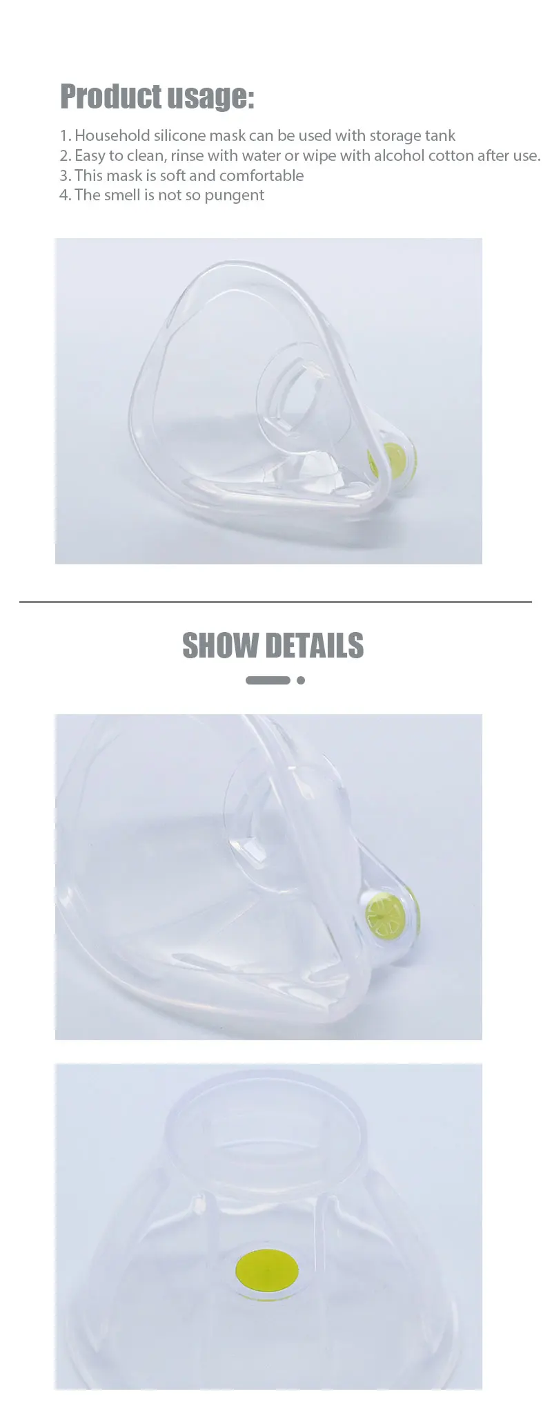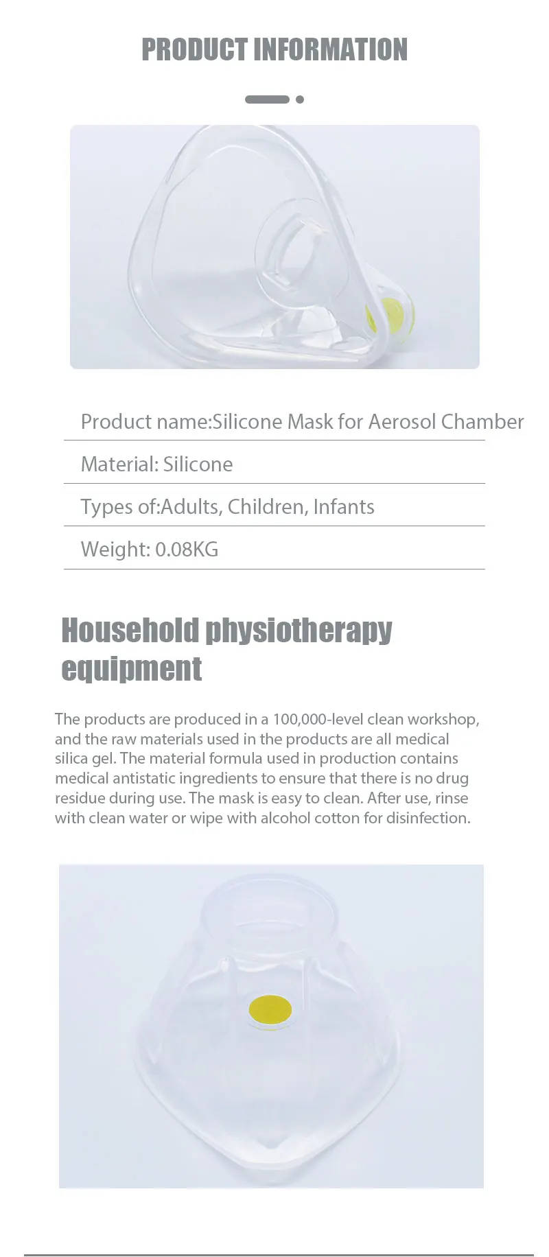 Quick details Place of Origin: Zhejiang, China Features: Household physiotherapy equipment Material: Medical grade Silicone Application: For local administration on the patient's body surface and natural cavity Packaging: PE packaging Product name: Silicone Mask Features: The aerosol chamber is used to help People suffering from respiratory diseases Such as chronic bronchitis, paralysis of the larynx or tracheal collapse