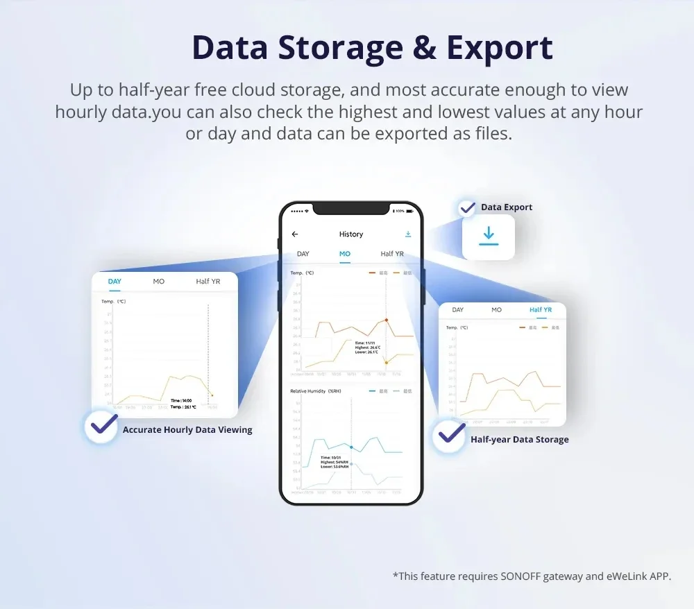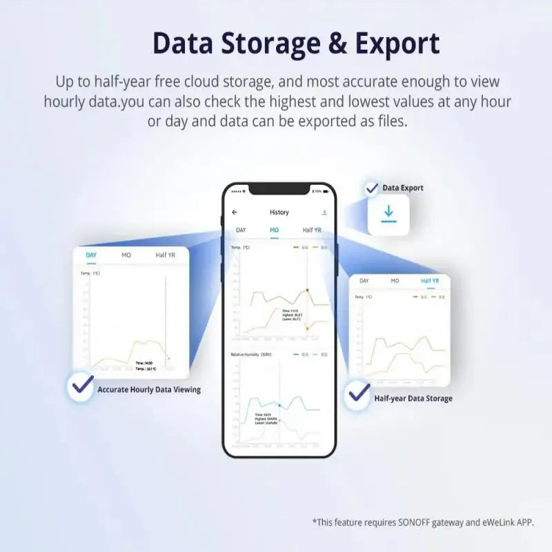 【Data Storage & Export】Up to half-year free cloud storage, and most accurate enough to view hourly data, you can also check the highest and lowest values at any hour or day and data can be exported as files.