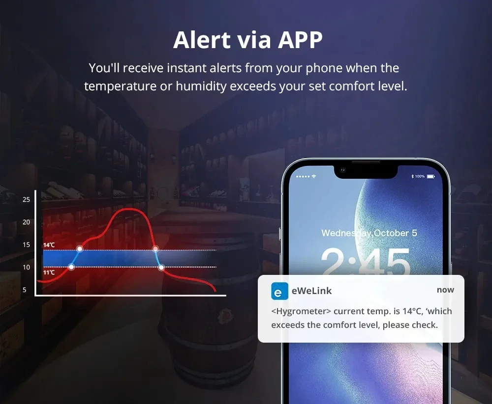 【App notifications】You’ll receive instant alerts from your phone when the temperature or humidity exceeds your set comfort level.
