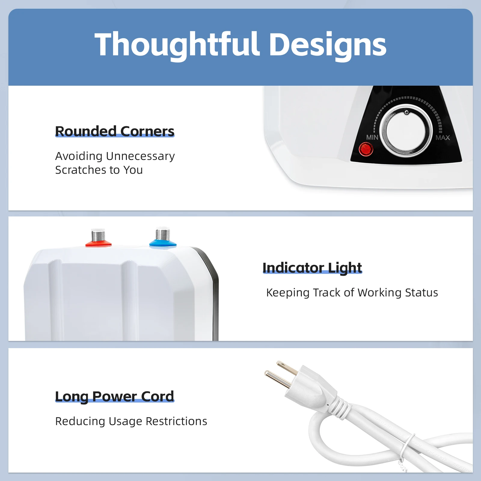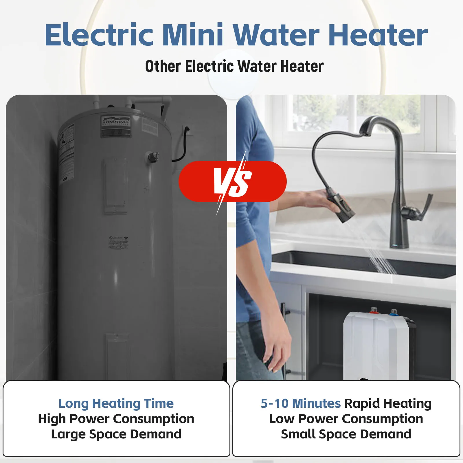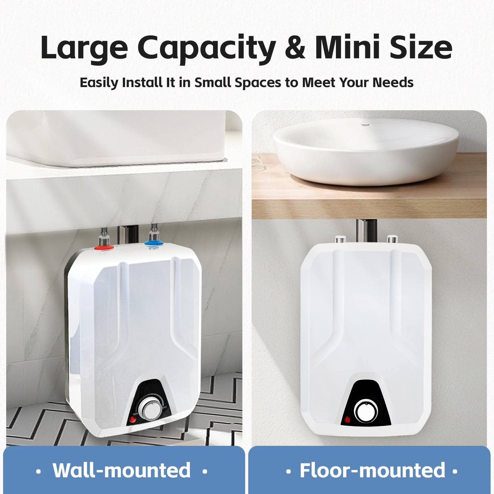 Large Capacity&Mini Size: It's small in size(9.44*7.67*13.38in), but its capacity can reach 2.1 gallons. You can easily install it on walls or floors under sinks or other small spaces to meet your hot water supply needs.