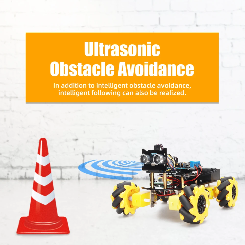The ultrasonic obstacle avoidance function enables the robot car to follow specific objects or people while avoiding any obstacles in its path