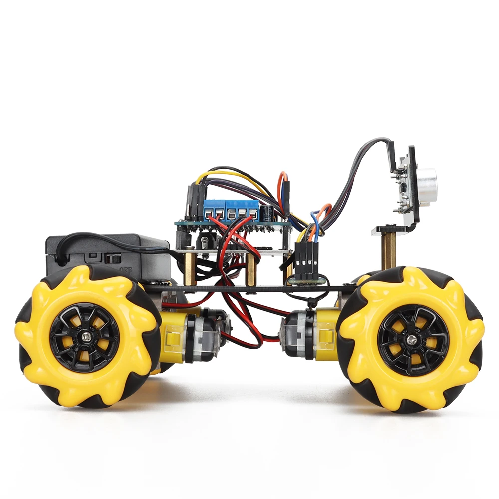 This is a great cost-effective and interesting robot car kit with simple mechanical structure, cute appearance and easy installation.The robot is equipped with omni wheels, it can move fast in all directions. It has the functions of Rotate 360° & Omni-directional movement and obstacle avoidance.