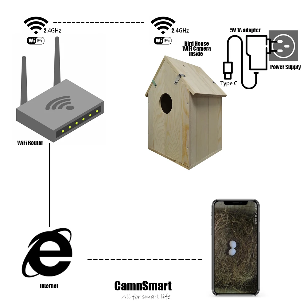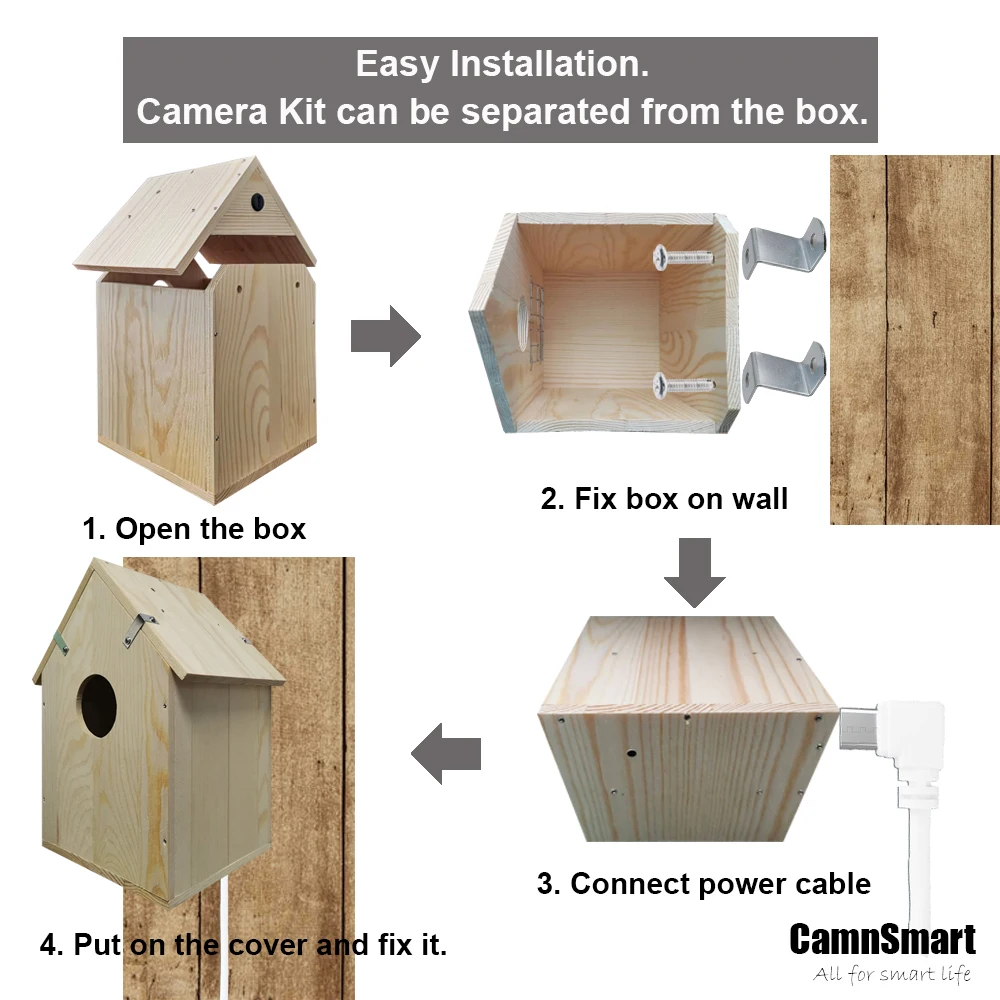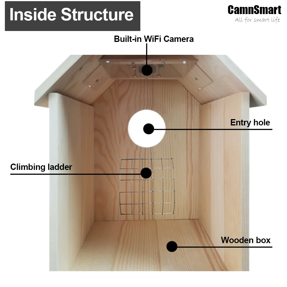This is a Bird Box which equipped with HD wifi camera inside. You can view the nest situation (live time& playback) in your cellphone APP anytime and anywhere.