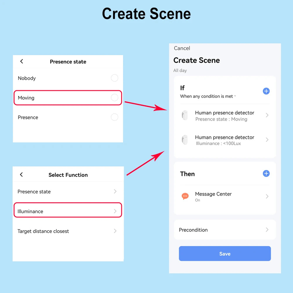 Illuminance monitor in Tuya Smart APP enables its smart feature as smart scene linkage with other smart devices,especially your house lights to ON/OFF automatically as the brightness changes;Besides,you can intelligently linkage the sensor to other smart home devices for home automation.